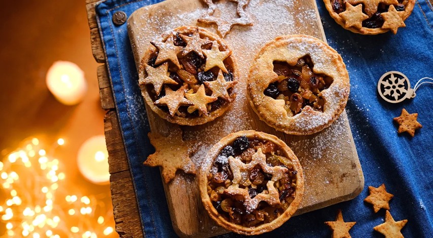 Reikės (8 porcijoms): 450 g miltų, 300 g atšaldyto sviesto, 2 kiaušinių trynių, 50 g cukraus, 0,5 šaukštelio jūros druskos; įdarui: 250 g obuolių, 225 g smulkių geltonųjų razinų, 110 g smulkių tamsiųjų razinų, 110 g stambių geltonųjų razinų, 30 g cukruotų vyšnių, 50 g apelsinų cukatų, 15 g sviesto, 1 citrinos sulčių, tarkuotos 1 citrinos žievelės, 115 g cukraus, 50 ml viskio arba romo, 0,25 šaukštelio muskato, 1 šaukštelio cinamono, gvazdikėlių, kardamono, imbiero miltelių mišinio.