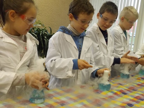 Susirinkę „Nevėžio“ pagrindinės mokyklos pradinukai nekantravo pasinerti į jiems dar nepažįstamą chemijos pasaulį. Apsirengę baltais chalatais, užsidėję apsauginius akinius, apsimovę pirštines vaikai pirmiausia susipažino su pagrindiniais laboratorijoje naudojamais indais, saugumo taisyklėmis. O jau tuomet prasidėjo darbas šalčio, spalvų, skysčių burbulų ir ugnies laboratorijose.