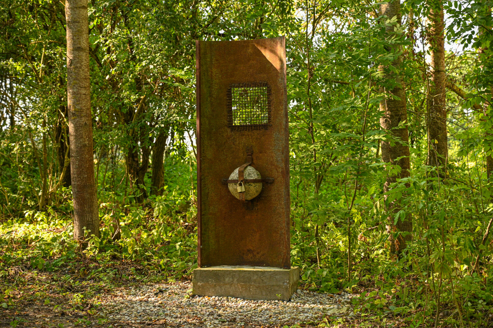 „Skulptūros neprivalo būti gražios. Kaip ir visa kūryba, jos vertinamos pagal tai, kiek pažadina patį žmogų, kiek jam sukelia emocijų“, – aiškina A. Pajuodis, rodydamas į skulptūrą, kurioje spyna užrakintas lauko akmuo. Žiūrėk – ir galvok ką nori.