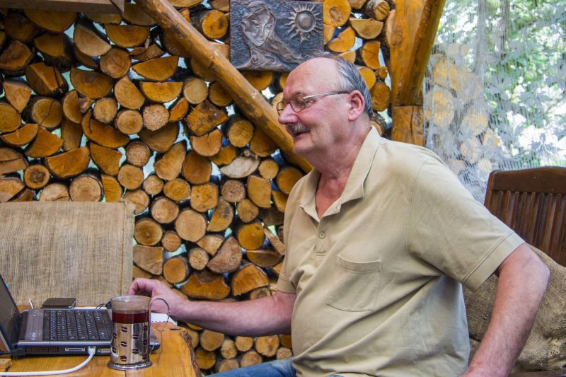 Jaukiame priemiesčio namo kiemelyje, paties įrengtoje pavėsinėje J. Čergelis atsinešęs kompiuterį ir dirba. O kartais, visus darbus atidėjęs, pasikviečia draugų, kuria pirtelę, o paskui visus vaišina gardžiu plovu.