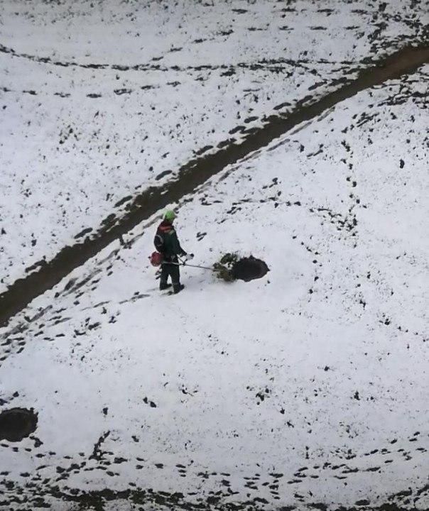 Būtent iš tokių kiemų Panevėžyje prieš kelias dienas internete išplito trumpas filmukas, sukėlęs nemenką ažiotažą. Jame nufilmuota, kaip šienpjovys su nešiojamąja žoliapjove pjauna apsnigtą žolę.