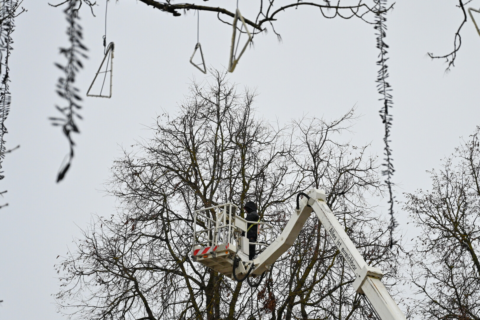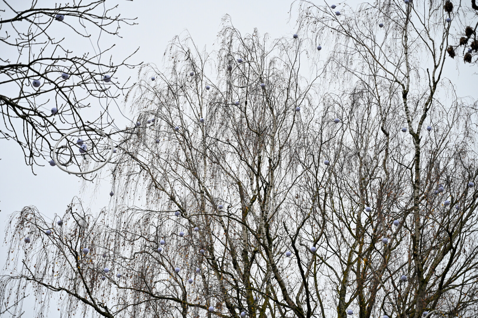 Pernai po ilgos pertraukos Laisvės aikštėje Kalėdoms pastatytą 13 metrų aukščio natūralią žaliaskarę puošė auksiniai ir sidabriniai žaislai bei raudoni kaspinai.