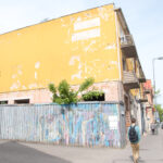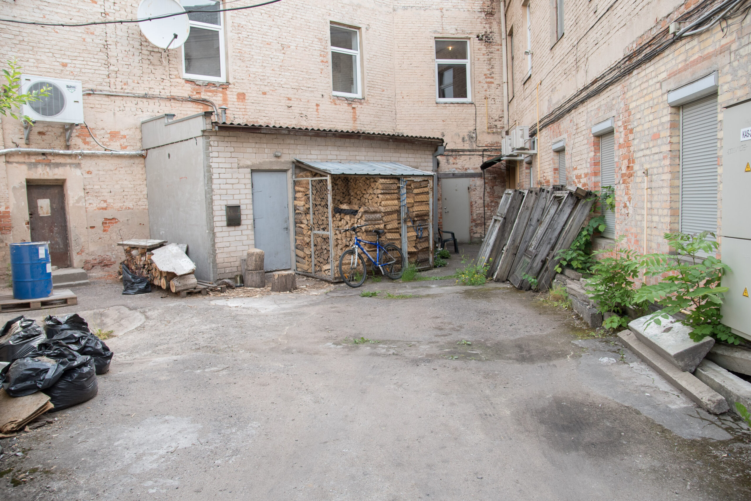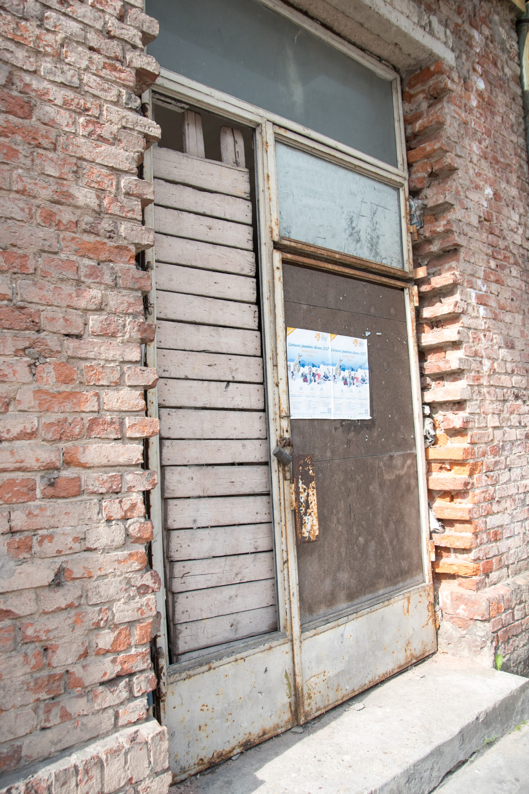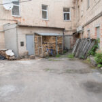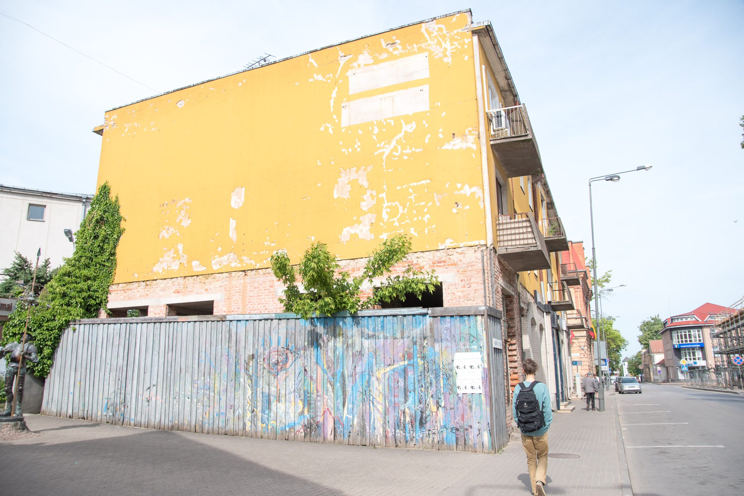 Prastos būklės ir statinys teatro „Menas“ pašonėje. Namo durys ir langai užkalti, sienas saugo speciali tvora, viduje voliojasi statybų atliekos.