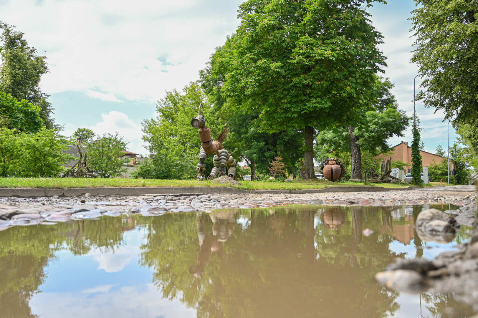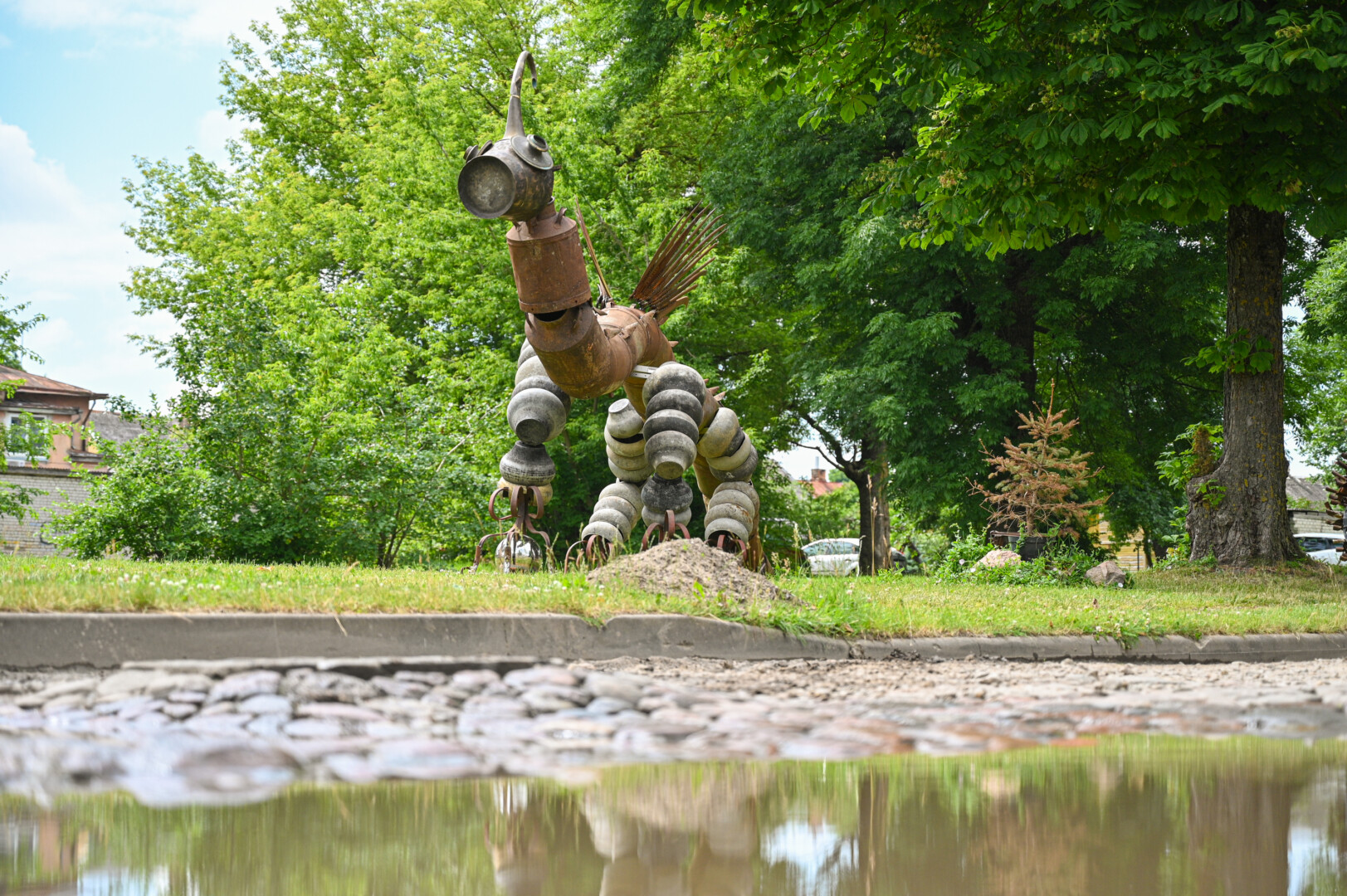 Originalius kūrinius iš metalo laužo ir nereikalingų daiktų kuriantis panevėžietis verslininkas Rimantas Kiela per porą savaičių iš senų bidonų, vadinamųjų sagonų – didelių ketaus puodų be ąsų – ir senų žemės ūkio padargų dalių sumeistravo įspūdingo dydžio drakoną.