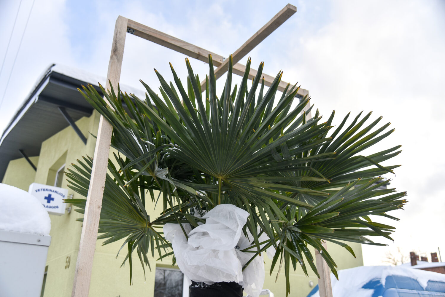 Atėjus šalčiams sodininkai ir gėlininkai eglišakėmis nuo speigo skuba dengti jautresnius augalus, o panevėžietis veterinarijos gydytojas Liudas Brazdžionis nuo 20 laipsnių šalčio bando apsaugoti jo kieme vešinčią vėduokliškais lapais pasipuošusią ir dabar tebežaliuojančią palmę.