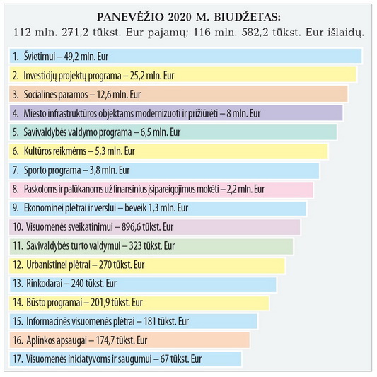 Miesto biudžetą sudaro 17 programų. Kaip ir ankstesniais metais, daugiausia Panevėžys išleis švietimo reikalams. Tam šiemet skirta 49,2 mln. eurų, pernai buvo 4 mln. mažiau. Antroji pagal skiriamų lėšų dydį – Investicijų projektų programa. Jai atseikėta 25,2 mln. eurų. Socialinės paramos organizavimui Panevėžyje skirta – 12,6 mln., infrastruktūros objektams modernizuoti ir prižiūrėti – 8 mln. eurų.