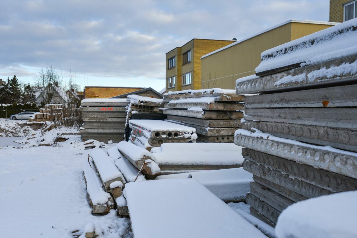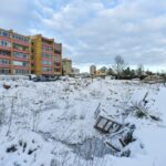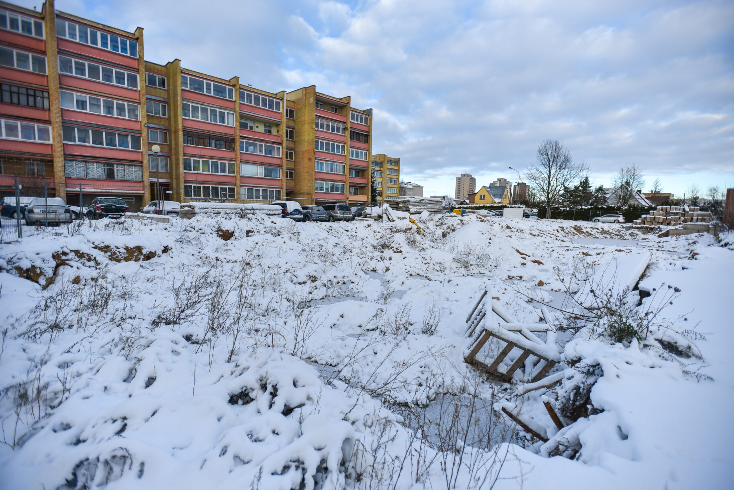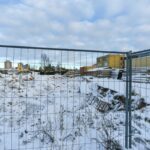 Statybvietę juosia segmentinė tvora, kai kur ji jau apgadinta. Aptvertoje zonoje želia aukštos piktžolės, styrančios net iš po sniego.