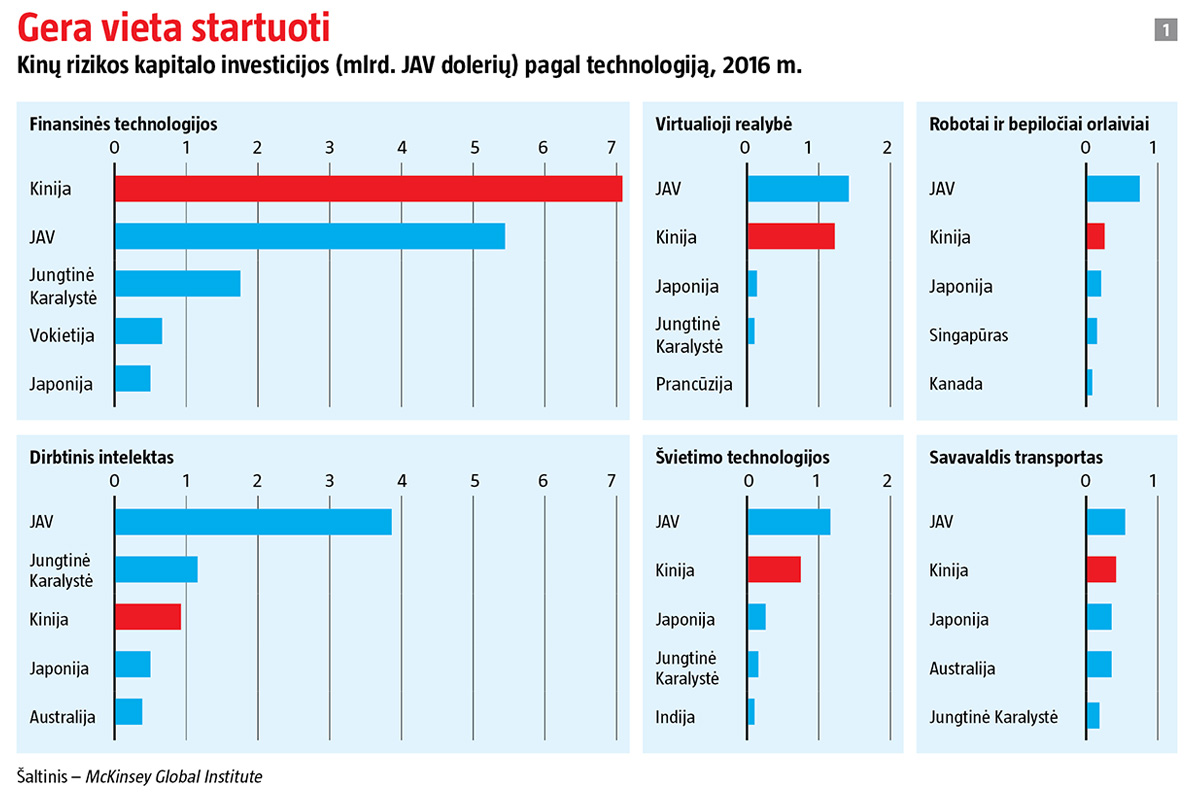 Jos priklauso naujai išradingų jaunų įmonių, ateinančių iš Kinijos, bangai. Prieš keletą metų Kinijos naujovės tebuvo kopijavimas ir klastotės. Dabar varomoji jėga – įžūliai drąsi, talentinga ir globaliai mąstanti verslininkų karta. Į ją investuojamos didžiulės sumos. 2014–2016 m. į Kinijos įmones investuotas rizikos kapitalas siekė apie 77 mlrd. JAV dolerių, palyginti su 12 mlrd. 2011–2013 m. Pernai ši šalis buvo pirma pasaulyje pagal investicijas į finansų technologijas, tempą diktuojančias JAV vejasi kituose sektoriuose (žr. 1 grafiką).