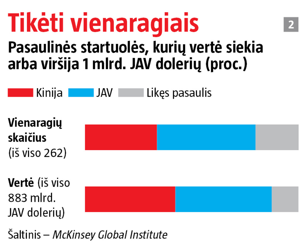 Neseniai apskaičiuota, kad bendra 89 Kinijos vienaragių (milijardu ar daugiau dolerių įvertintų startuolių) vertė perkopė 350 mlrd. JAV dolerių ir priartėjo prie bendros JAV vienaragių vertės (žr. 2 grafiką). O nugalėtojų laukia gražus laimikis. Kinijoje yra 609 milijardieriai, JAV – 552.