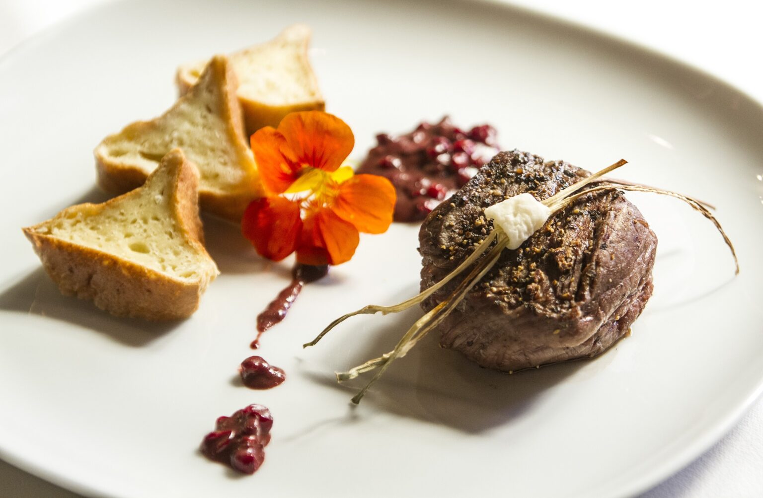 Sudedamosios dalys: 200 g jautienos išpjovos, 1 v. š. vytintų bruknių, 100 ml „Pinot Noir“ ar kito raudonojo vyno, 50 ml rudojo padažo, druska, skaldyti pipirai, gėlės puošybai.