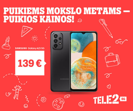 Mokiniai ar studentai, ieškantys naujo išmaniojo telefono už gerą kainą, turėtų atkreipti dėmesį į „Samsung Galaxy A23 5G“. Šiuo metu šį naujosios kartos išmanųjį telefoną be sutarties įsigyti galima už vos 139 Eur. Vienkartinis laikmenos mokestis – 5,25 Eur. Įrenginį įsigijus kartu su 24 mėn. 5 GB (4G), neribotų žinučių ir pokalbių plano sutartimi, telefono ir paslaugų plano mėnesinė įmoka bus  16,85 Eur/mėn. Pradinė įmoka – 25,25 Eur.