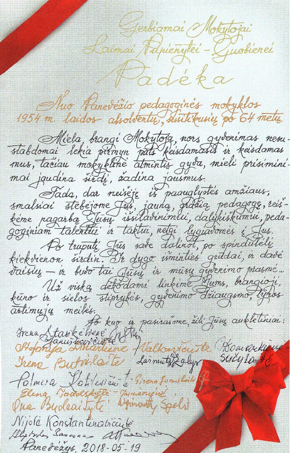 Bene paskutinis gautas prieš gerus metus, 2018 m. gegužės 15-ąją nuo Panevėžio pedagoginės mokyklos 1954 m. laidos auklėtinių, susitikusių po 64 metų. Mokytoja sako, kad šiemet irgi buvo planuota susitikti, jau po 65-erių metų, bet susitikimas neįvyko. Tačiau mokytoja nusiteikusi optimistiškai ir mano, kad kitais metais susitikimas bus organizuotas ir ji jame dalyvaus. Kažin ar mokytoja yra praleidusi bent vieną buvusių mokinių susitikimą, į kuriuos ji visuomet kviečiama.