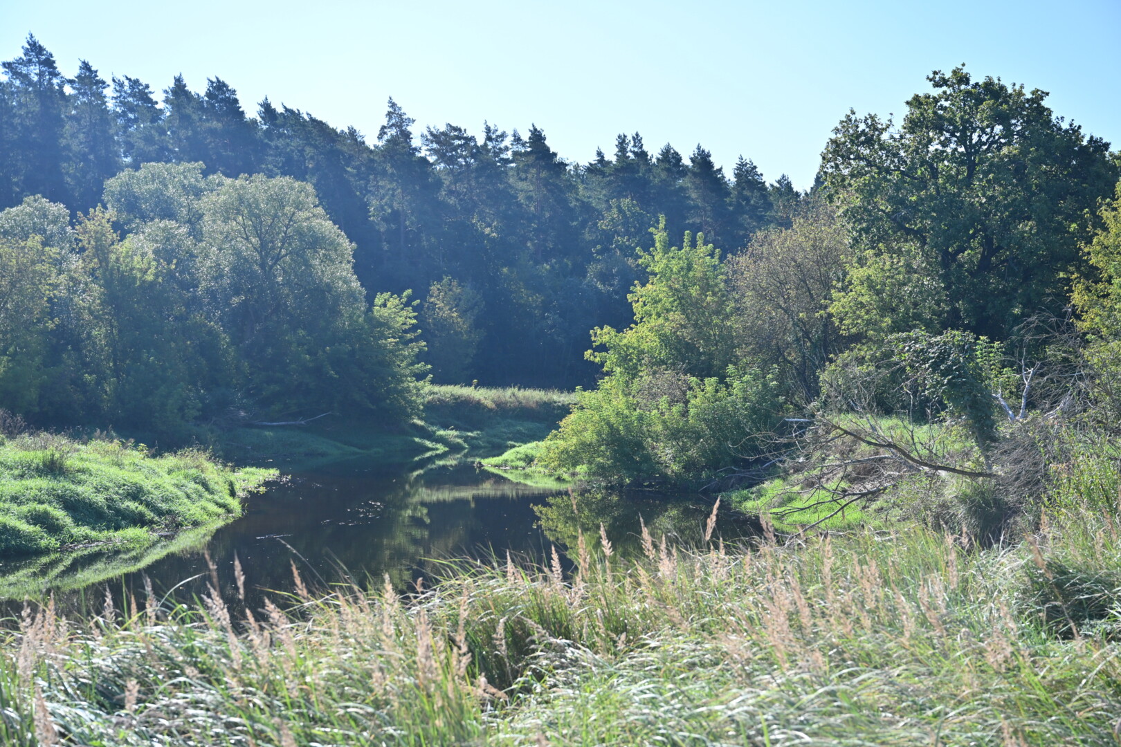 Nevėžis netoli tos vietos, kur kairiajame jo krante auga valstybės saugomas botaninis gamtos paveldo objektas – Kalnelio daugiakamienė pušis, gana sparčiai virsta pelke.