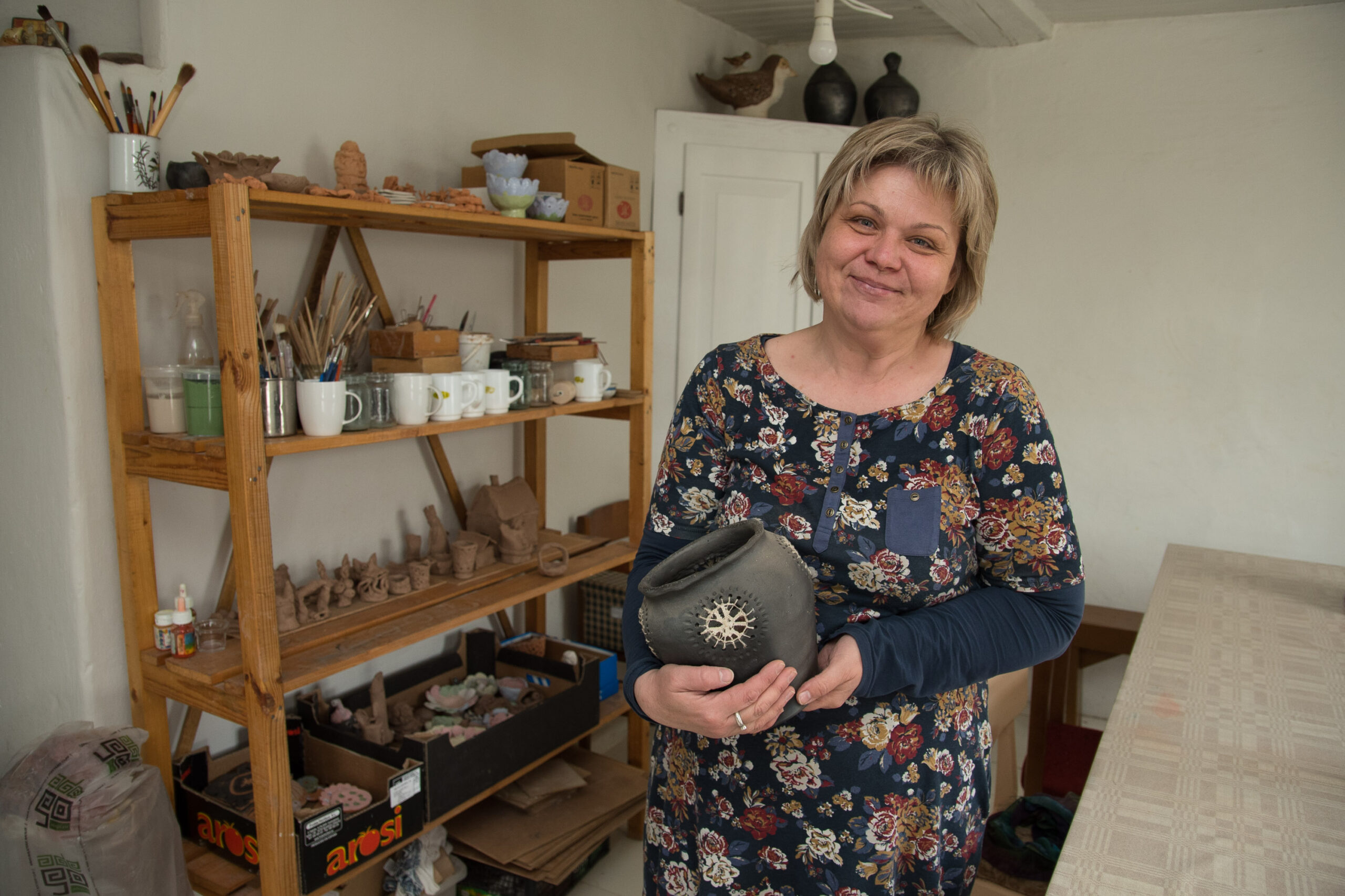 Sunku ir Ramygaloje amatų rezidenciją įkūrusiai, mokytojos darbą dėl rankdarbių palikusiai Laimai Kiškienei. Didelius planus mokyti lietuviškų amatų bei pati kurti turėjusi tautodailininkė savo išpuoselėtoje ir lankytojams pritaikytoje sodyboje liko viena. Ramygalietė užsiregistravo prekiauti virtualioje Kaziuko mugėje. Anksčiau prekybai gyvose mugėse laiko vis nerasdavusi L. Kiškienė kol kas džiaugiasi galimybe pirkėjams pristatyti savo darbus. Pokalbio dieną ramygalietė kaip tik ruošėsi išsiųsti pirkėjams į Vilnių du siuntinius: keramikos dirbinį ir vaško žvakę.