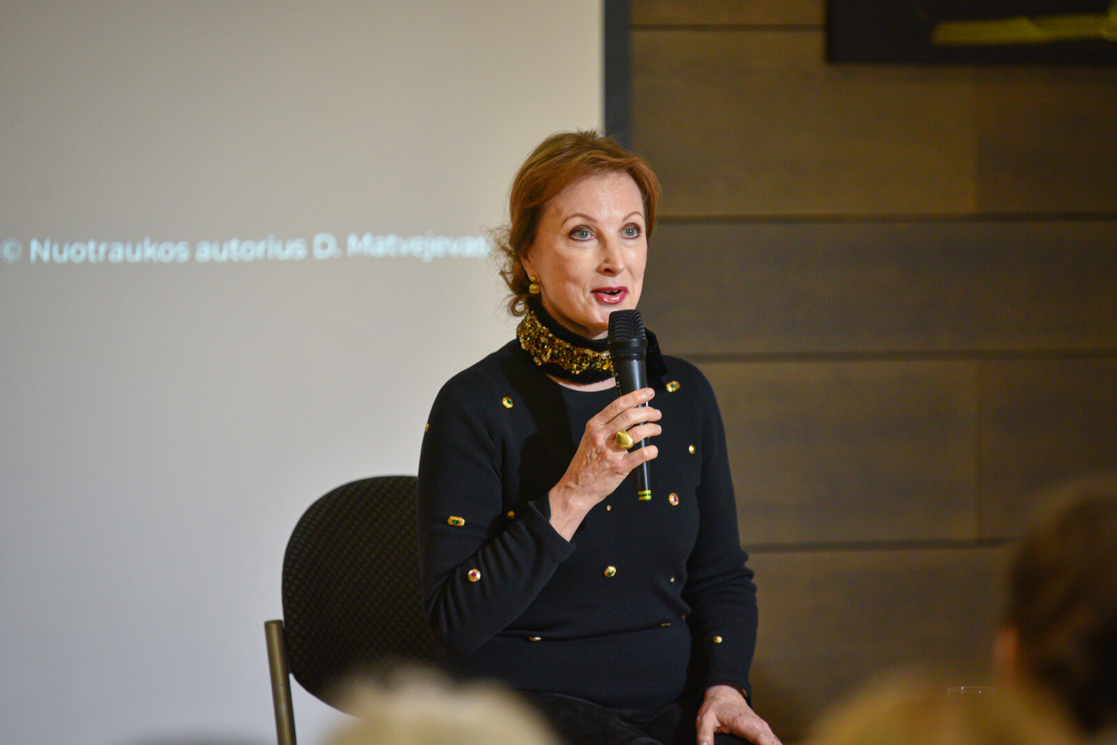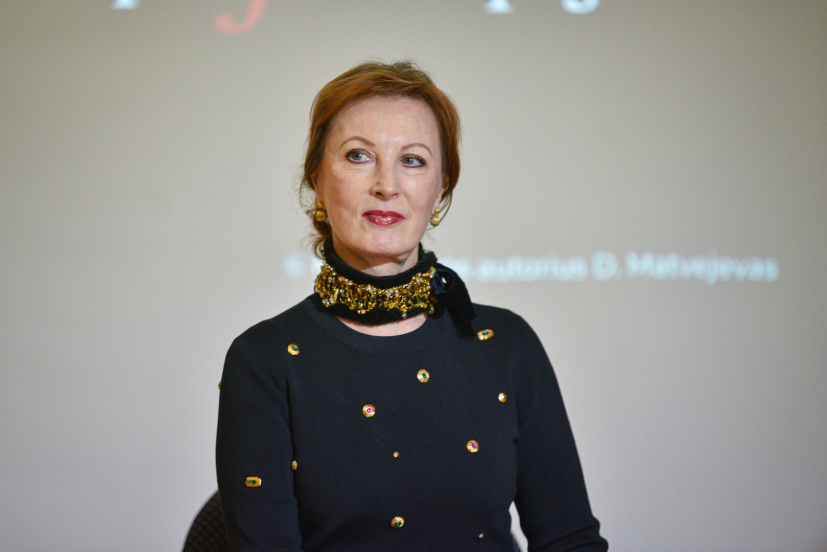 Juodos kelnės, karoliukais siuvinėtas juodas megztukas, aukštakulniai, tiesi nugara, santūri šypsena, ramus balsas, taupūs judesiai – kukli, tačiau nepaneigiamai charizmatiška, švytinti inteligentiškumu ir elegancija.