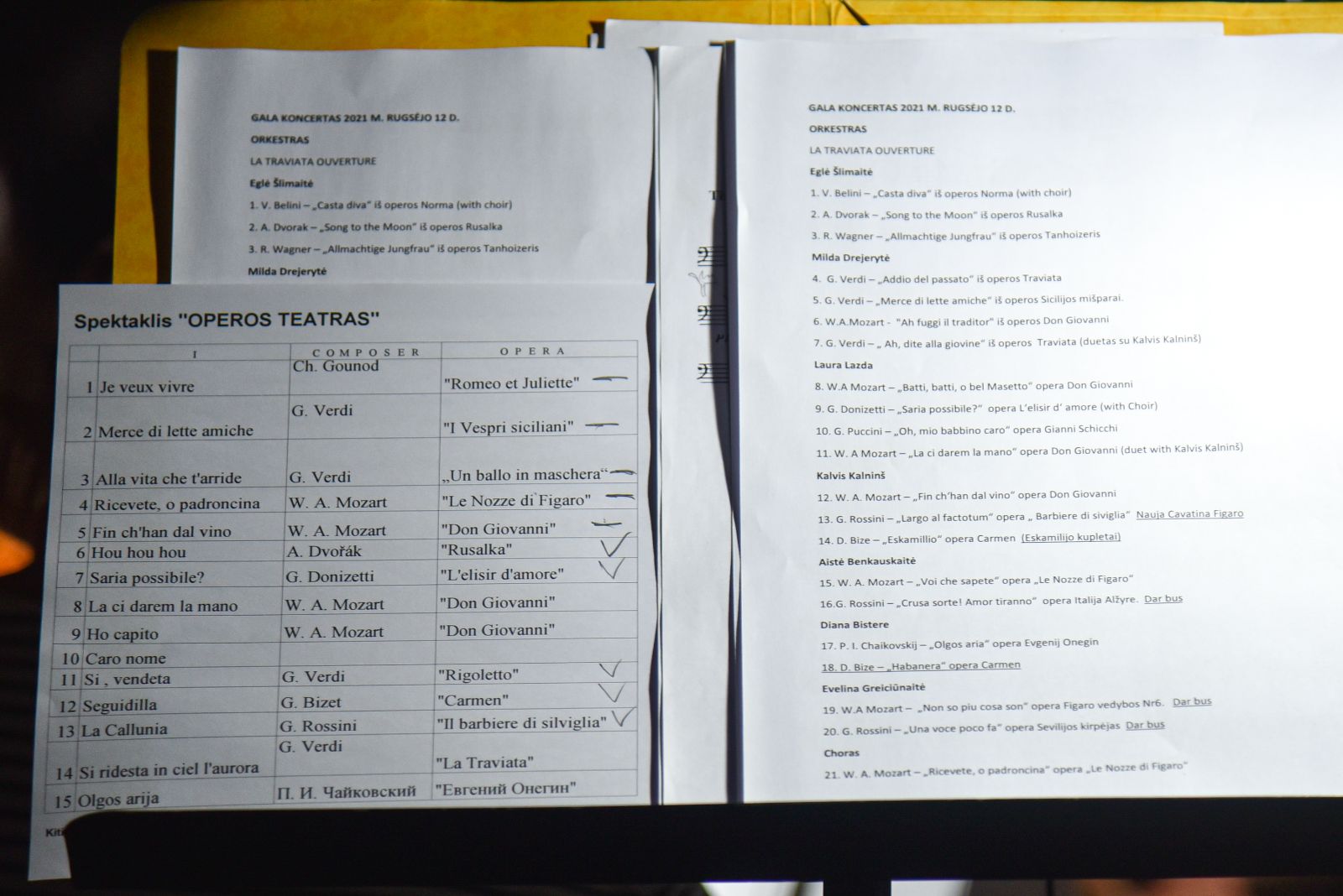 Spektaklio dirigentas Martynas Bražas pridūrė, kad „Operos teatre“ skambančios arijos atlikimo prasme yra itin sudėtingi kūriniai, iš muzikantų reikalaujantys tikro virtuoziškumo. Visgi, anot dirigento, iššūkis įveiktas, sugroti geriausius vienas kitą keičiančius, tikrai sudėtingus kūrinius muzikantams yra jų profesionalumo pasitikrinimas.