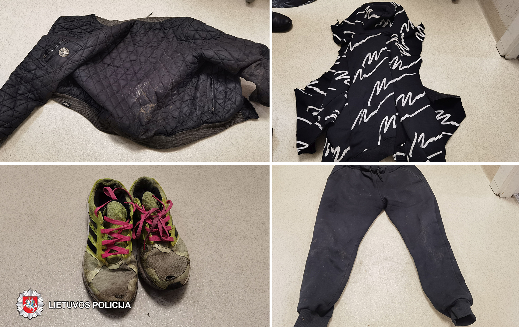Vyriškis smulkaus kūno sudėjimo, žemo ūgio, vilkėjo juodas kelnės, juoda striuke, avėjo ryškius sportinius batus.