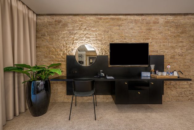 Bendradarbiaujant su architektūros studijos „Plazma“ architektais Evelina Talandzevičiene, Ryčiu Mikulioniu, Dina Sargautiene ir Skirmante Deniušiene, visos naujojo viešbučio idėjos gimė „ne ant popieriaus“, o vietoje, svarstant apie unikalių pastatų rekonstrukciją bei kalbantis su menininkais. „Erdvių charakteristika gana komplikuota: dideli aukščių skirtumai, netaisyklinga patalpų geometrija, – vardija E. Talandzevičienė, – Visa tai sąlygojo stilistinį pasirinkimą ir atidumą istorinių pastatų ypatybėms – jei kreiva, tegul taip ir būna. Su pagarba senamiesčiui stengėmės sujungti sena ir nauja į vieną dermę.“