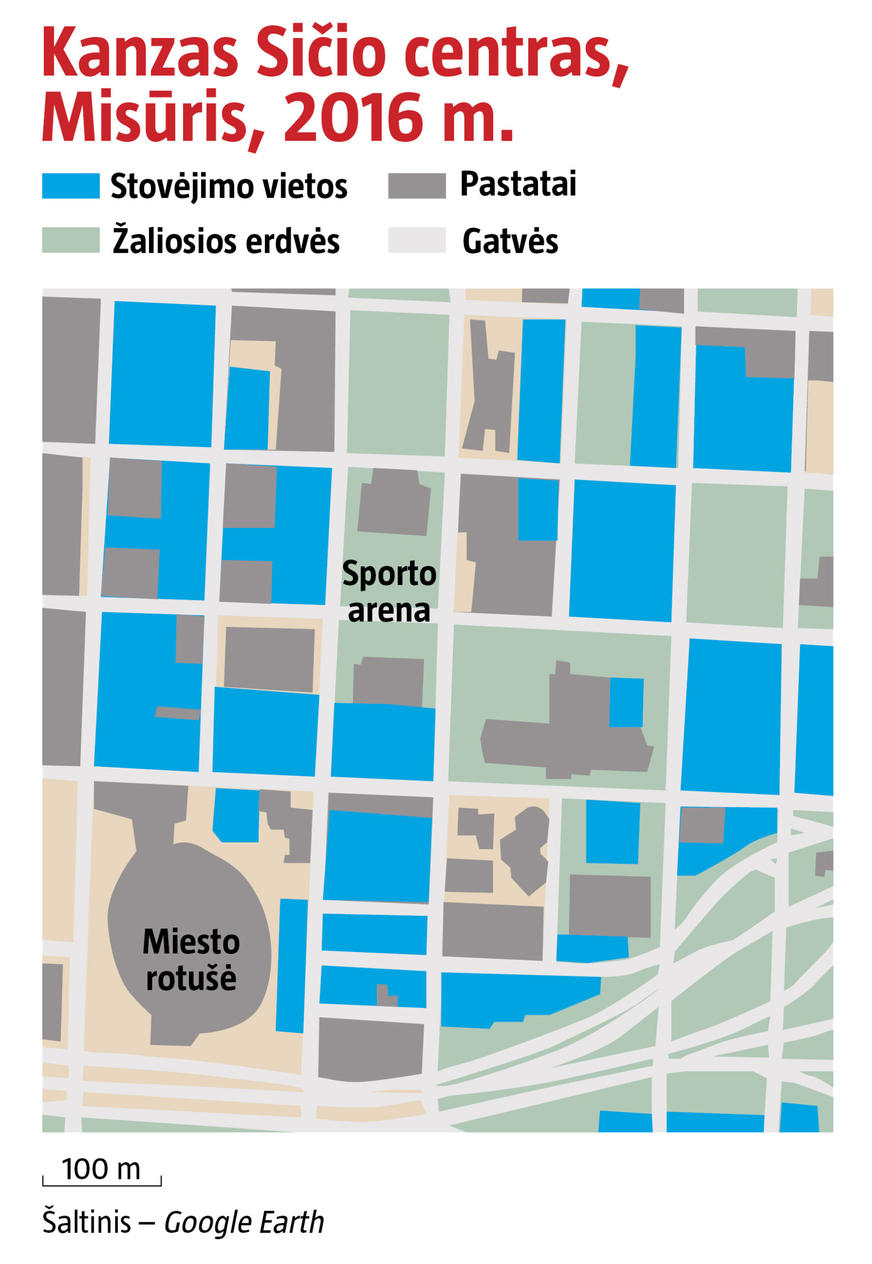 Daroma žala prasideda nuo akivaizdaus fakto, kad automobiliams pastatyti reikia daug vietos – paprastai numatoma 12–15 kv. metrų. Pridėjus privažiavimo kelius, vienam automobiliui tenkanti vieta išauga maždaug dvigubai. Galima palyginti: šią vasarą „The Economist“ persikels į pastatą Londono centre, kur vienam darbuotojui numatoma 10 kv. metrų ploto. Tokiuose miestuose kaip Kanzas Sitis (žr. žemėlapį), kur žemė pigi ir įprasta įrengti antžemines stovėjimo vietas, centriniai rajonai primena asfalto vandenynus, nusagstytus pastatais.