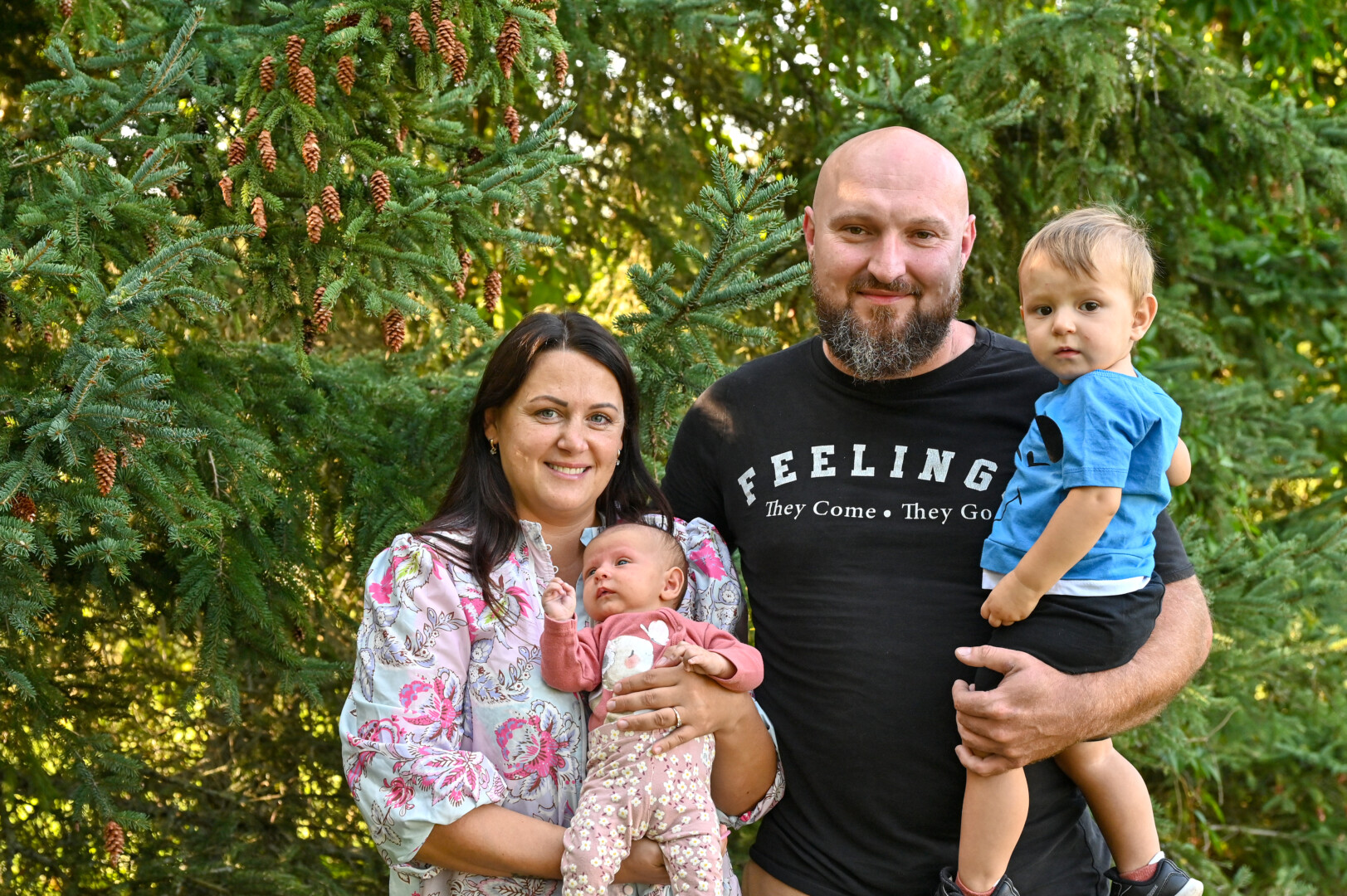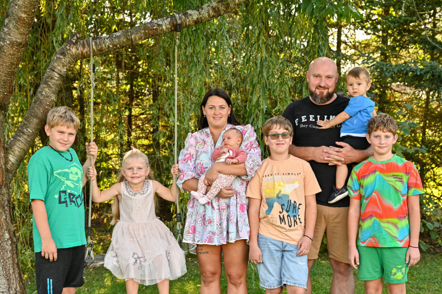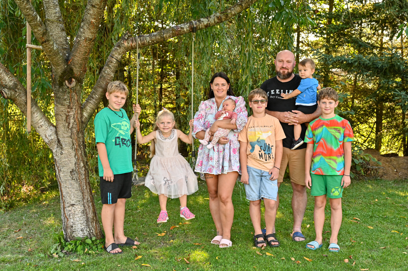 Kieme pasirodo ir šios aštuonių vaikų šeimos galva Andrius su mažuoju sūneliu Justu Karoliu ant rankų, o paskui atskuba mama Raimonda, stumdama vežimėlį su miegančia liepą gimusia pagranduke Austėja.