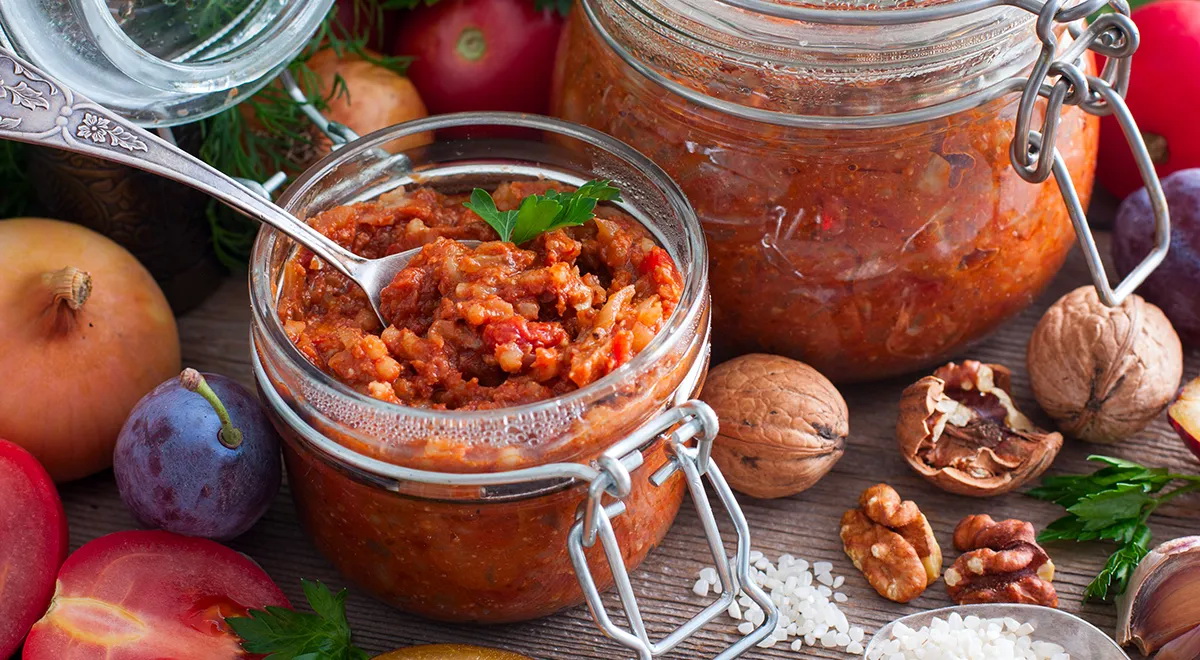 Reikės: 2 kg pomidorų, 500 g svogūnų, 100 g česnakų, 200 g slyvų, 100 g graikinių riešutų, 50 g apvaliagrūdžių ryžių, 1 aitriosios paprikos, 2 šaukštų cukraus, 1 šaukšto druskos, 1 šaukštelio „Chmeli suneli“ prieskonių mišinio, 3 šaukštų acto, 0,5 stiklinės aliejaus, kvapiųjų pipirų, lauro lapo, kalendrų ir petražolių – pagal skonį.