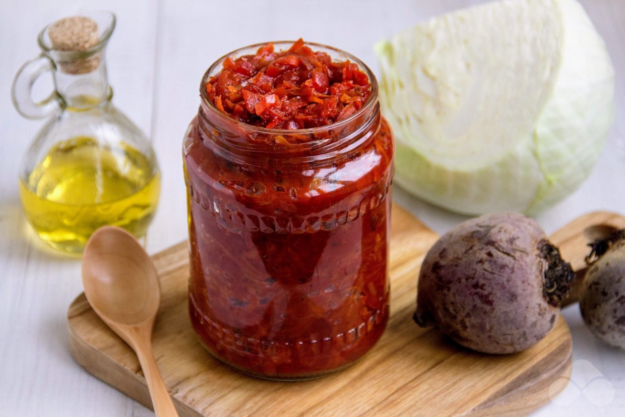 Reikės: 1 kg burokėlių, 1 kg kopūstų, 1 kg pomidorų, 500 g svogūnų, 500 g morkų, 500 g paprikų, 200 g aliejaus, 6 šaukštų cukraus, 4,5 šaukšto rupios druskos, 3 šaukštų acto (9 proc.), prieskonių – pagal skonį.