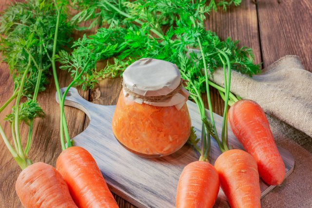 Reikės: 1 kg morkų, 500 g svogūnų, 2–3 česnako skiltelių, 1 šaukšto acto (9 proc.), 0,5 šaukštelio druskos, 2 šaukštų aliejaus, 3 šaukštų vandens, juodųjų pipirų žirneliais.