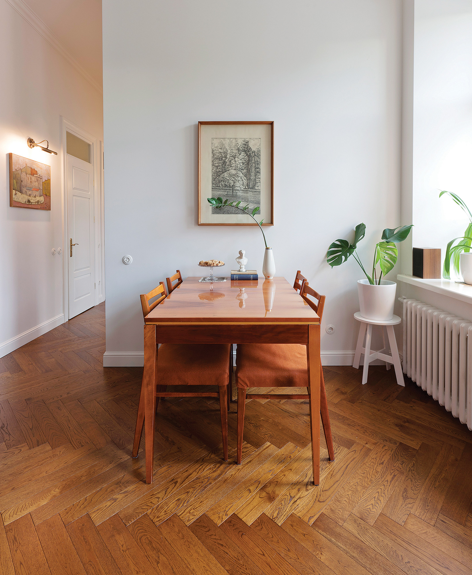 Erdvi laiptinė, vedanti aukštyn masyviomis laiptų pakopomis ir senoviniais turėklais, – lyg pirmoji užuomina apie nestandartinius vilniečių Tado Kazakevičiaus ir Ievos Folk namus. Vos pravėrus jų buto duris nuotykių ir atradimo nuojauta dar labiau sustiprėja. Viktorija Vitkauskaitė architektės ir grafikos dizainerio bei fotografo klausinėjo, kaip į seno namo drabužį jiems pavyko įvilkti praeito šimtmečio vidurio dvasią.
