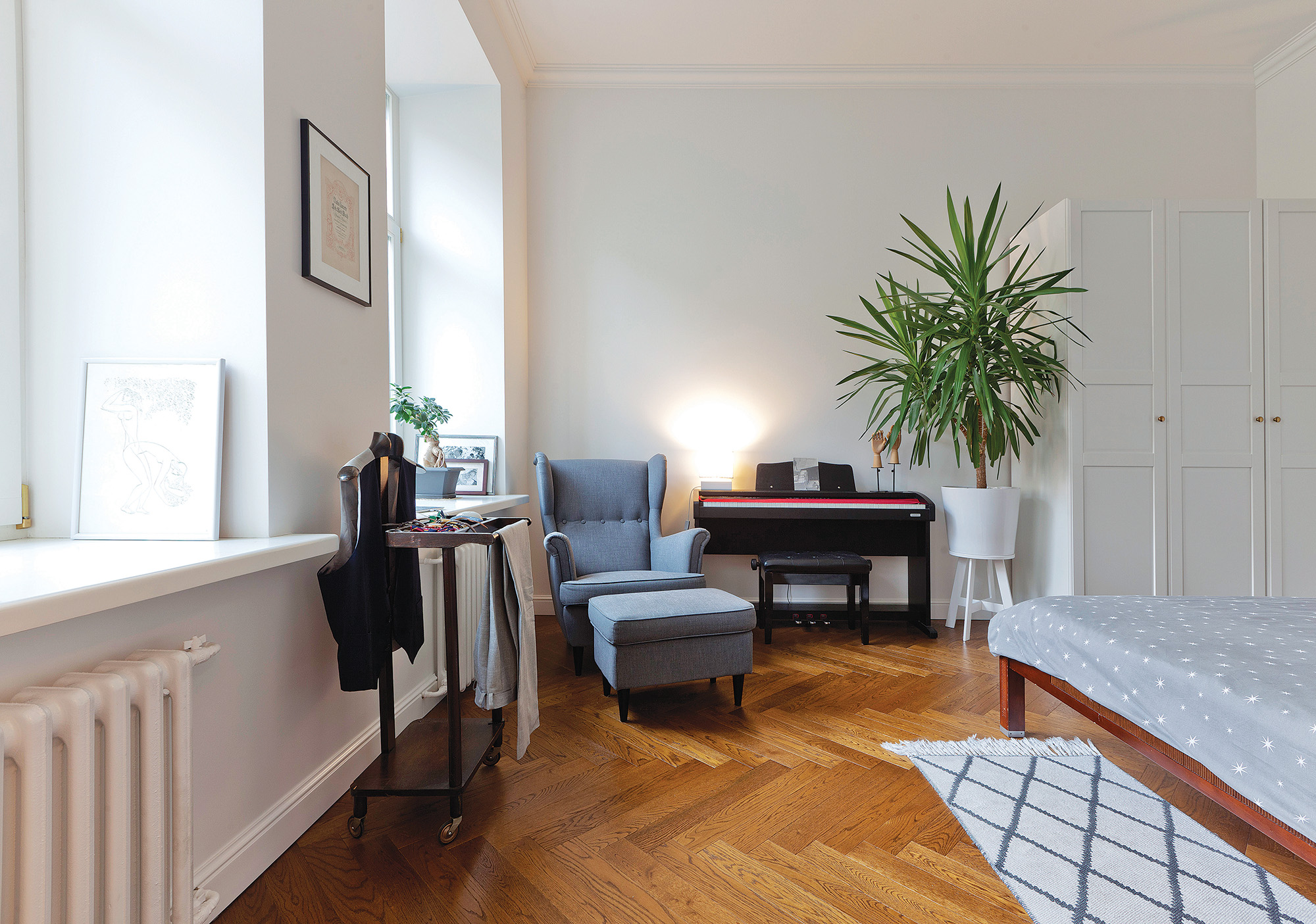 Panašios stilistikos foteliai grakščiomis linijomis – taip pat iš fotografo šeimos. „Mano mama septintajame dešimtmetyje įkalbėjo senelius nusipirkti visą baldų komplektą“, – sako pašnekovas. Stilingos spintelės aukštomis kojomis, ant kurios stovi patefonas, įsigijimo istorija šeimininkams ir šiandien kelia šypseną. Tai – buvusi sovietinio baldų komplekto patalynės dėžė, kurią jie pusvelčiui įsigijo sendaikčių turguje. „Baldą pardavę žmonės negalėjo patikėti, kad man jo tikrai reikia“, – juokiasi I. Folk. Dabar už lakuotų spintelės durelių slepiasi gausi plokštelių kolekcija.