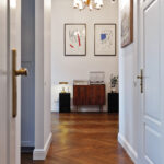 Pirmykštį šios erdvės vaizdą sunku įsivaizduoti dabar, žvalgantis iki menkiausios detalės apgalvotuose namuose. Senoviniuose interjeruose matomos medinės grindys, dvivėrės durys, subtilios ir saikingos gipso dekoro detalės, netgi senoviniai jungikliai gali suklaidinti: atrodo, kad naujakuriams šią erdvę tereikėjo užpildyti baldais. Iš tiesų buvo priešingai: visos šios detalės apgalvotos ir sukurtos arba įlietos į interjerą naujai, pavyzdžiui, senovinių jungiklių įsigyti šeimininkai intensyviai ieškojo maždaug porą mėnesių. I. Folk juokiasi prisiminusi, kad jau įsikūrus namuose vienas bičiulis atėjęs apsižvalgė ir nustebo: grindys juk paliktos autentiškos, durys – taip pat, net jungiklių nereikėjo keisti, tai ir remonto darbų neturėjo būti daug. „Be abejo, man toks jo įspūdis – komplimentas. Sakyčiau, kad buto „vokas“ – grindys, lubos, apvadai, durys – yra duoklė namui, jo istorijai. Norėjome, kad matytųsi, jog tai šimtametis pastatas. O tokioje erdvėje interjerą galėtum jau daryti kokį nori“, – pasakojo architektė.