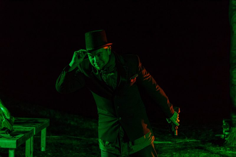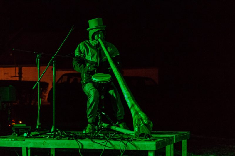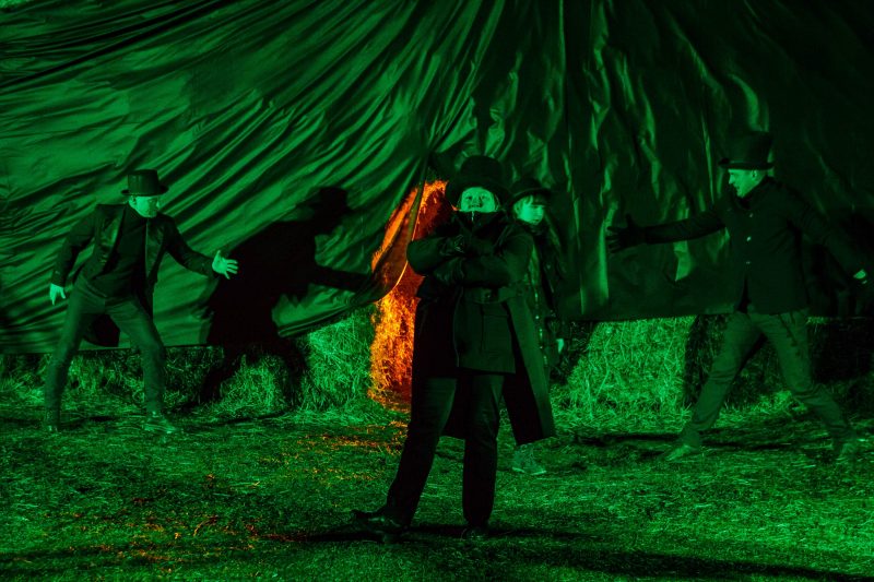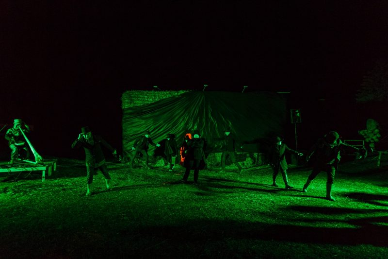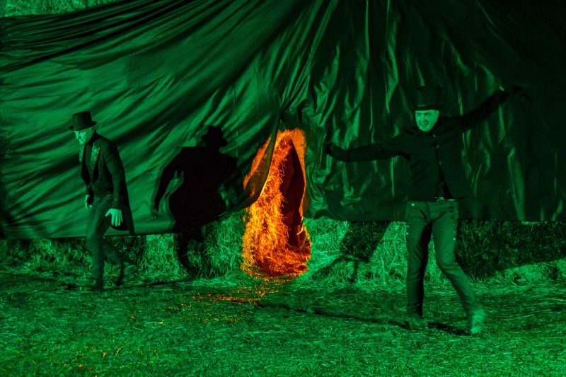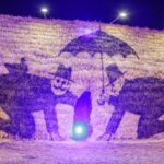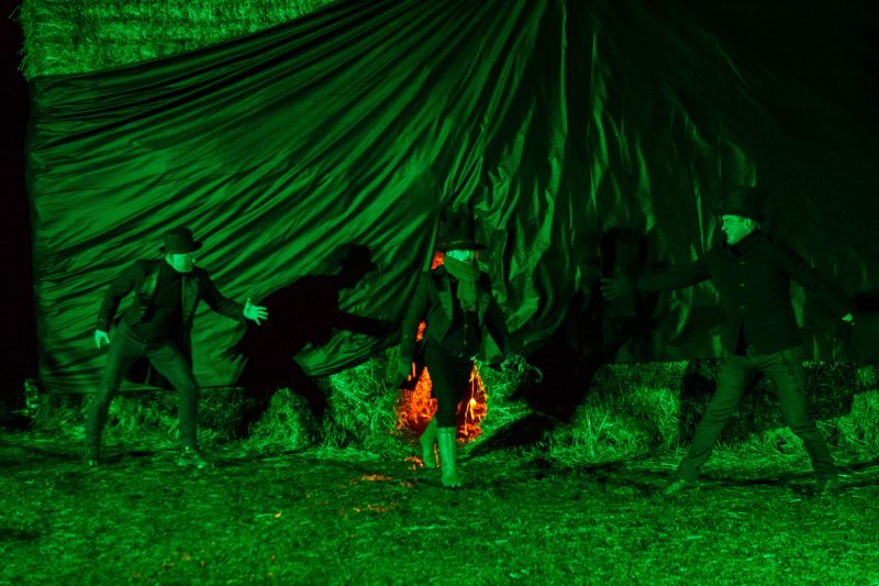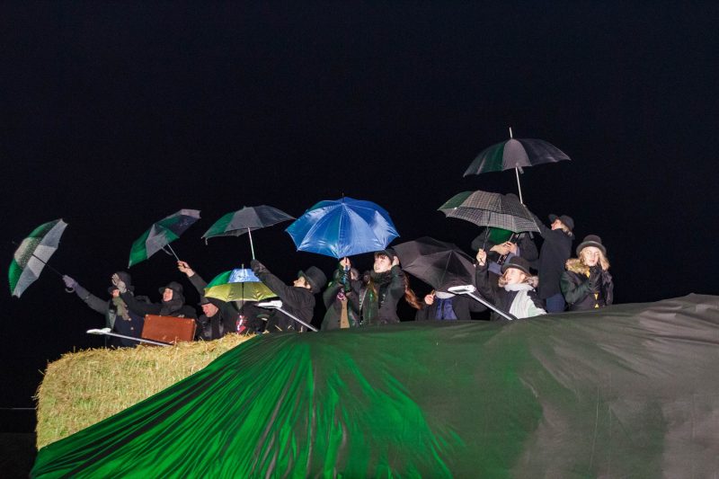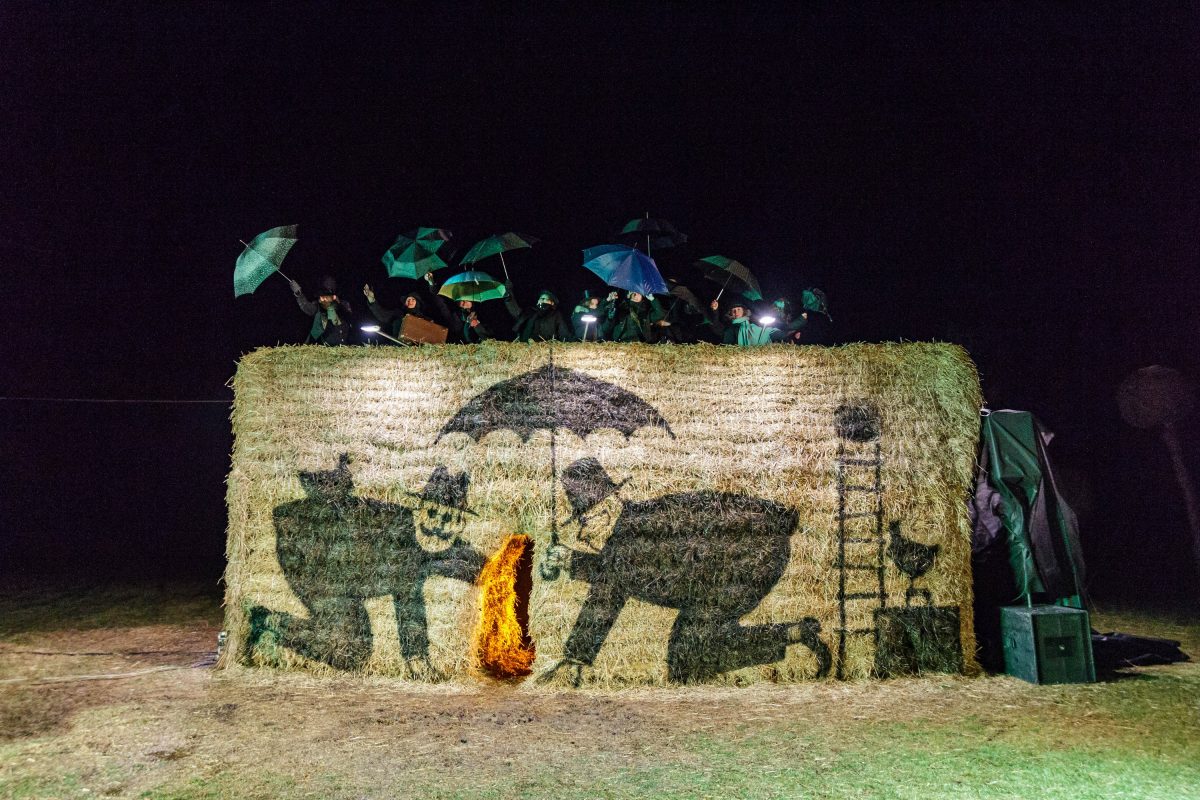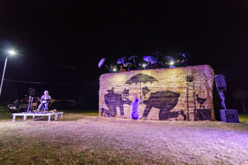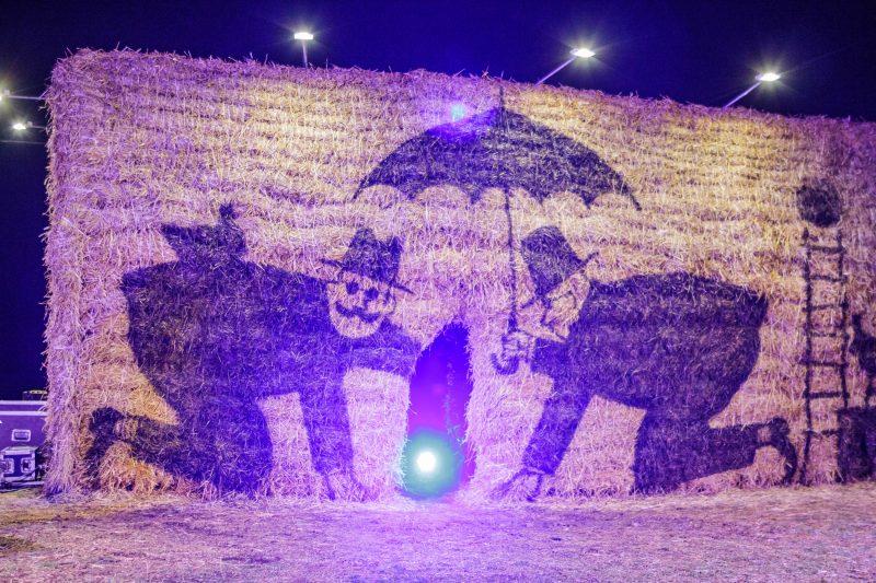 Gana vėjuotą vakarą, po Naujamiesčio kultūros centro atlikėjų teatralizuoto pasirodymo nuo didžiulės skulptūros nuslinko širma ir pasirodė kubo formos šiaudinis namas. Suformuotais laiptais galima patekti net ant jo stogo.