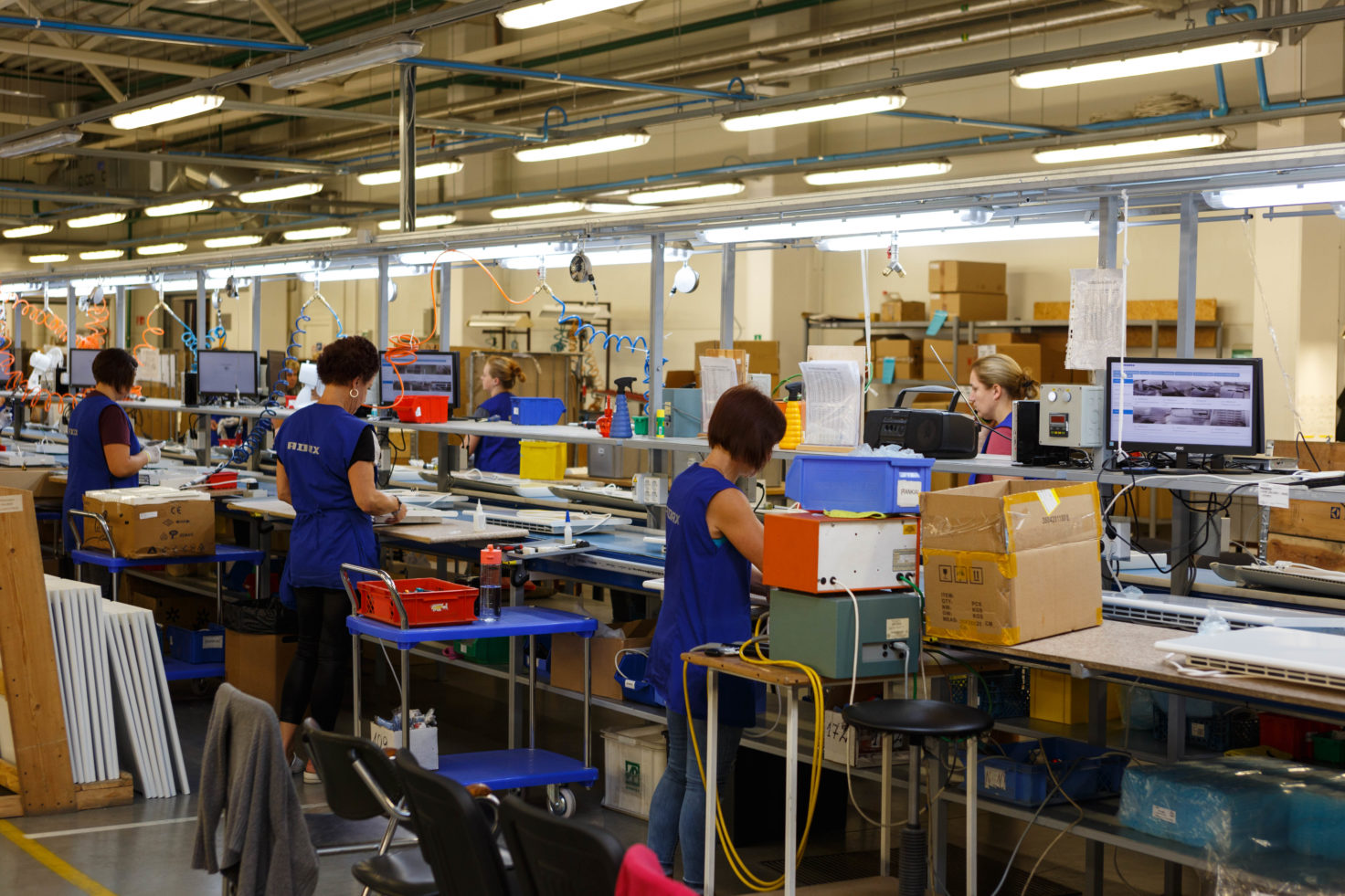 Pasak „Adax“ vadovo, praėjusiais metais įdiegta ir konvejerinė gamyba, o tai itin padėjo pagerinti darbo našumą ir kokybę. Anksčiau vienas žmogus gaminį surinkdavo nuo pradžios iki galo, o dabar vienas darbuotojas atlieka tik kelias operacijas. Nebereikia kiekvienam jų apsikrauti krūva įrankių ir detalių. Taip darbas atliekamas greičiau ir kokybiškiau. Konvejerinio darbo privalumas ir tas, jog daugelį operacijų gali kontroliuoti ir iki šiol tokio darbo nedirbęs žmogus – prie konvejerio esančiame kompiuterio monitoriuje rodoma, kokią operaciją reikia atlikti.