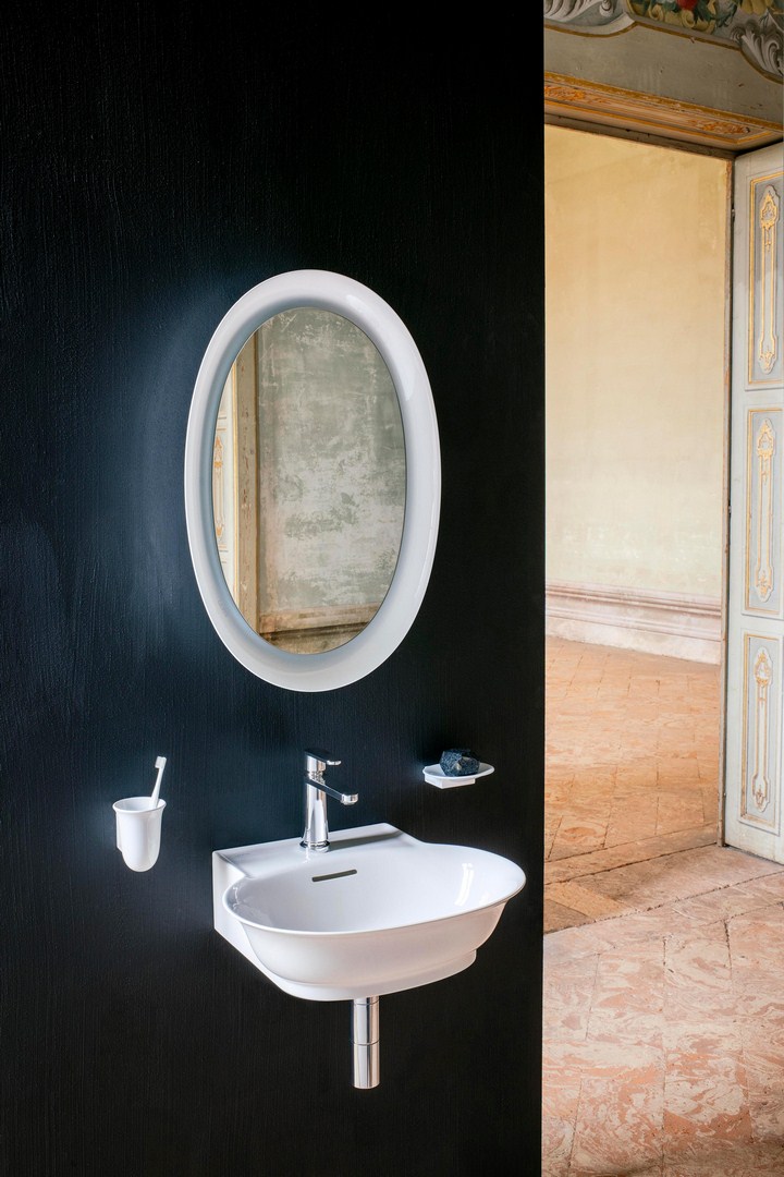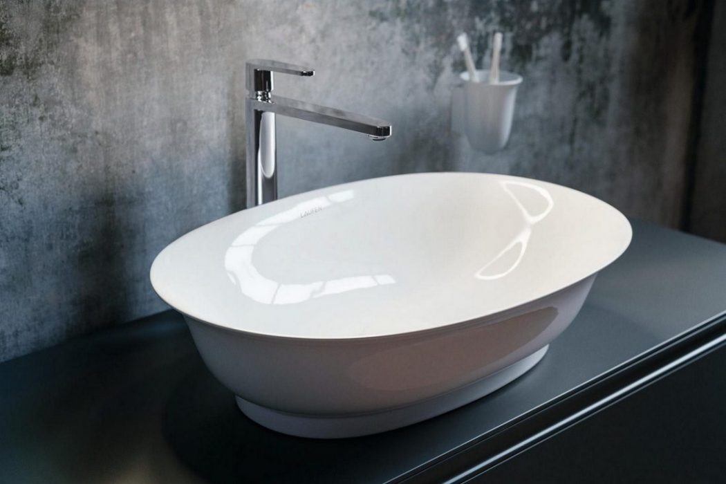 Neatsiejama šios kolekcijos dalis – žvilgsnį prikaustanti daili vonia. Įdomu, kad ji pagaminta iš kompanijos „Laufen“ sukurtos inovatyvios medžiagos „Sentec“, tačiau vizualiai puikiai dera prie „SaphirKeramik“ praustuvų.