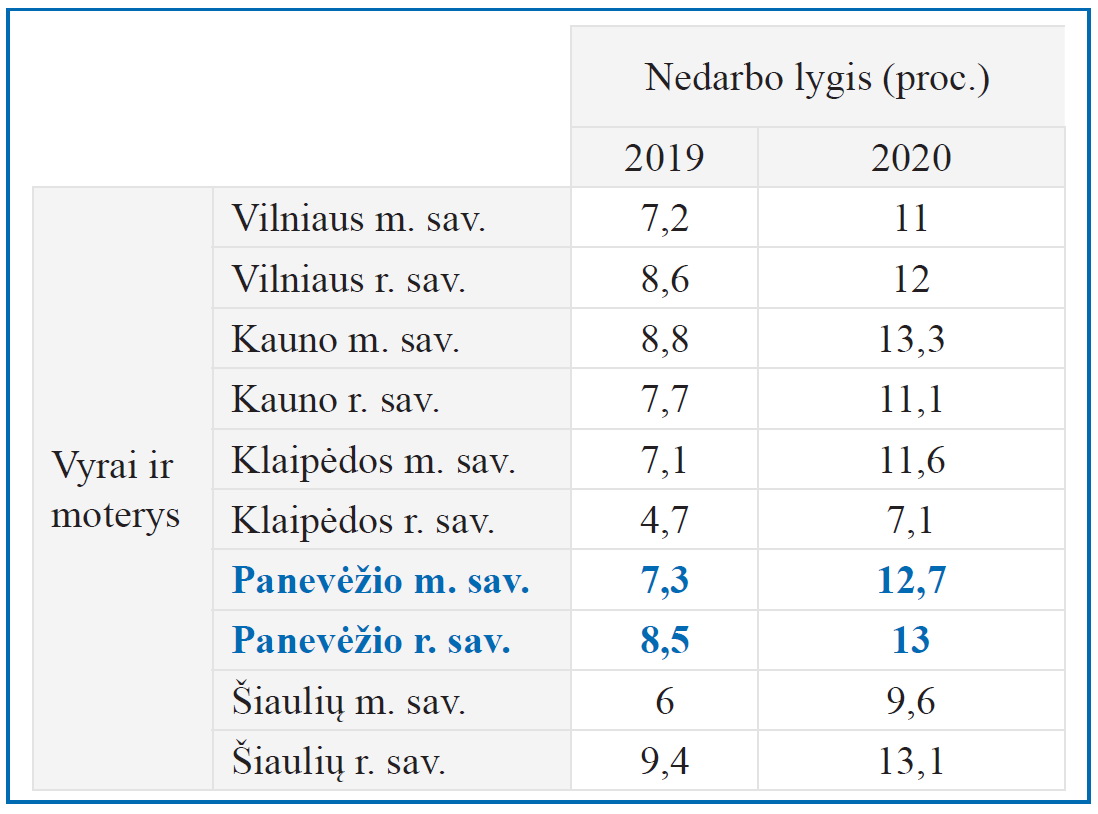 Panevėžio prekybos, pramonės ir amatų rūmų generalinis direktorius Visvaldas Matkevičius pripažįsta, kad darbdavių nuotaikos ganėtinai pesimistinės. Didžiosiose pramonės įmonėse situacija dar nėra tragiška, bet smulkusis verslas vos išgyvena. Pasak V. Matkevičiaus, Užimtumo tarnybos duomenys ne visuomet atspindi realų nedarbo lygį. Jau prieš pandemiją buvo keliama problema, kad valstybės politika mokėti pašalpas bedarbiams iškraipo darbo rinką: gana daug atvejų, kai žmonės, gaudami valstybės pagalbą, dirba nelegaliai.