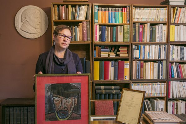 Vedėja atkreipia dėmesį į dar vieną J. Miltinio portretą – pasirodo, tai paties režisieriaus ranka pieštas autoportretas.