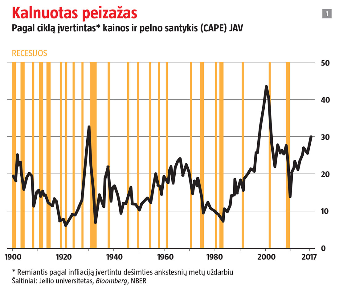 Pradėkime nuo įrodymų, kad akcijos brangios. Investuotojams patogu naudotis CAPE, nes akcijų kaina atspindi, kokią vertę investuotojai priskiria pelnui. S & P indekso, apimančio 500 didžiausių JAV biržose kotiruojamų įmonių, CAPE vidurkis nuo 1881 m. siekia 17. Šiandien šis rodiklis pakilo iki 30, todėl dabar nepaprastai brangu užsitikrinti pelno srautą (žr. 1 grafiką).