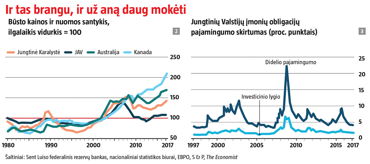 Dabar panagrinėkime NT. Nuo pasaulinės finansų krizės nenukentėjusiose šalyse, pavyzdžiui, Kanadoje ir Australijoje, būsto kainos gerokai viršija ilgalaikį vidurkį nuomos kainų atžvilgiu. JAV, kur dėl krizės namai atpigo, nominali būsto kaina jau peržengė 2008 m. piką ir vėl pralenkė ilgalaikį kainos vidurkį nuomos atžvilgiu. Jungtinėje Karalystėje NT kainos beveik pasiekė piką ir vidutinių pajamų, ir nuomos atžvilgiu (žr. 2 grafiką).