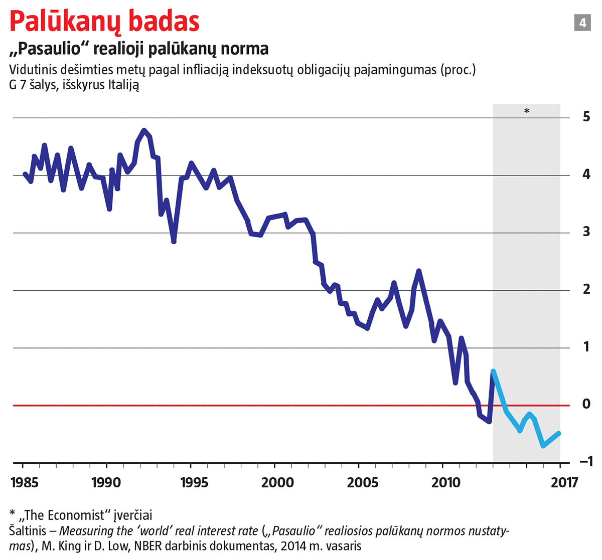 Pagrindinė turto kaina, kuri diktuoja toną kitose rinkose, – tai ilgalaikė palūkanų norma. Nuo XX a. 9-ojo dešimtmečio pradžios ilgalaikės realiosios palūkanų normos nuolat mažėja ir jau pasiekė istorines žemumas (žr. 4 grafiką). Vasarą dešimties metų JAV iždo obligacijų pajamingumas vos viršijo 2 proc., nors vėliau ūgtelėjo iki 2,3 proc. Net jei infliacija nebus itin didelė, atsižvelgus į būsimą jos poveikį, reali grąža bus dar mažesnė. Dešimties metų nuo infliacijos apsaugotos JAV obligacijos duoda tik 0,5 proc. palūkanų. Europoje realusis obligacijų pajamingumas – neigiamas.