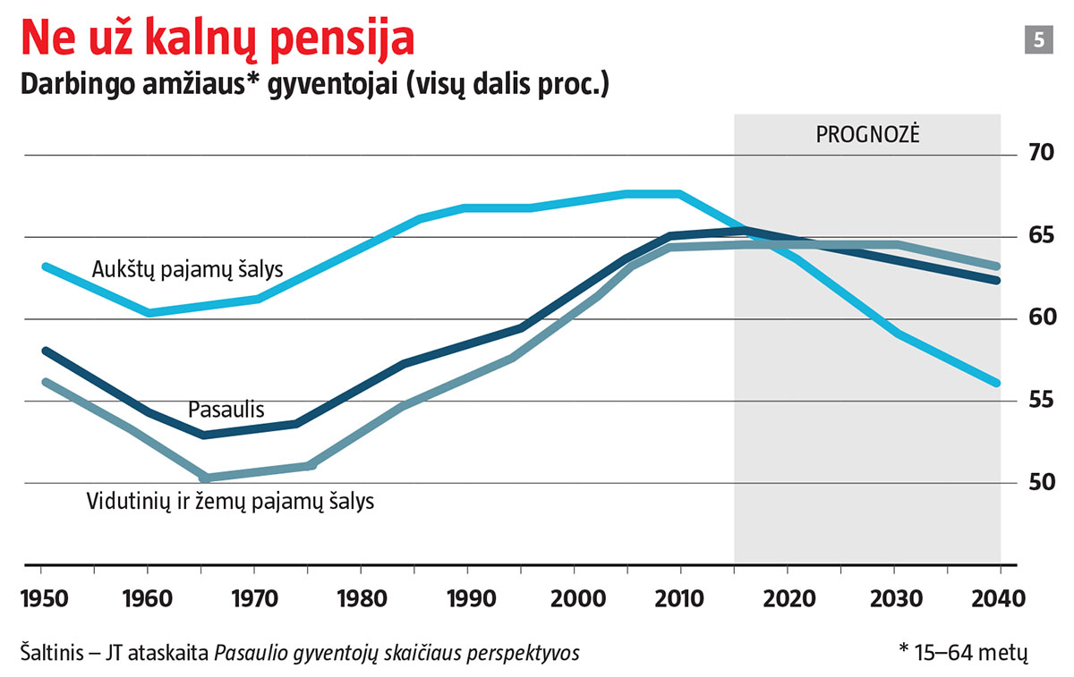 O centrinių bankų palūkanų normų politika? Atsargiai pradėjus griežtinti politiką, bankams gali būti sunku pasirinkti tinkamą tikslą, matant, kad padidėjęs polinkis taupyti pats savaime sukasi į priešingą pusę. 2007 m. 10 proc. BVP siekęs Kinijos einamosios sąskaitos perteklius (perdėto šalies taupumo ženklas) 2016 m. susitraukė iki mažiau kaip 2 proc. BVP. Neseniai paskelbtame darbe Charlesas Goodhartas iš Londono ekonomikos mokyklos ir Manojas Pradhanas iš tyrimų bendrovės „Talking Heads Macro“ teigia, kad turtingajame pasaulyje posūkio tašką pasiekė ir demografinė situacija, tad netrukus darbingo amžiaus žmonių procentas sumenks (žr. 5 grafiką). Vadinasi, bus mažiau taupančių pensijai ir daugiau pinigus leidžiančių pensininkų. Skaitydamas paskaitą Tarptautiniame valiutos fonde, Anglijos banko valdytojas Markas Carney neseniai sakė, jog neutralioji palūkanų norma galbūt auga visame pasaulyje, „tad pinigų politikai reikia judėti, kad galėtų stovėti vietoje“.