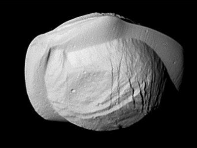 Vis tos pačios įdomybių sankaupos – Saturno žiedų – egzempliorius. Šio palydovo forma tokia nelygi ir duobėta, kad primena paprasčiausią bulvę.