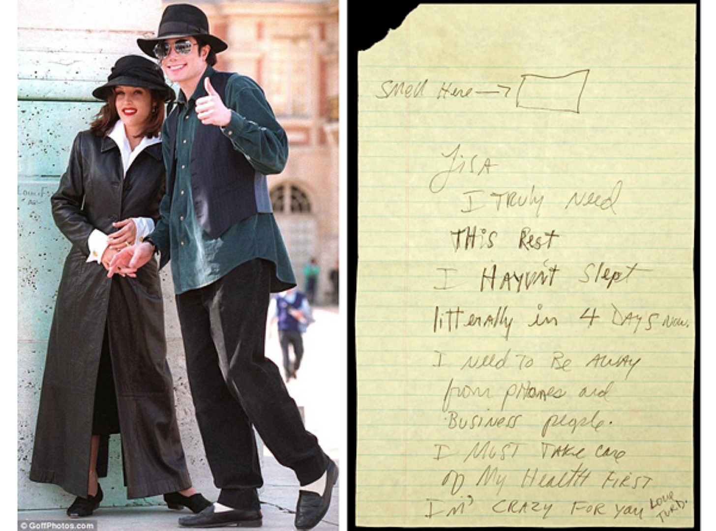 Žinutė, kurią popkaralius adresavo savo pirmajai žmonai, labai trumpa, bet kupina nevilties: „Liza, man labai reikia pailsėti, aš nemiegojau keturias dienas iš eilės. Man reikia pabūti kur nors, kur nėra telefonų ir agentų. Pirmiausia turiu rūpintis savo sveikata. Beprotiškai tave myliu.“
