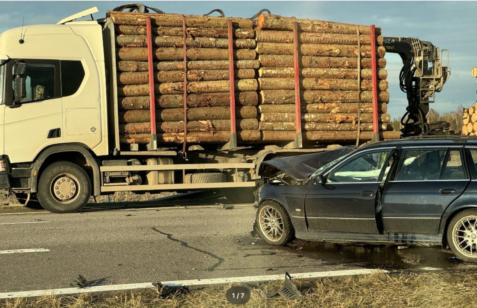 Policija praneša, kad šiandien apie 16 val. 56 min. kelyje Vilnius-Panevėžys (ties Raguvos sankryža) susidūrė miškovežis ir BMW automobilis.