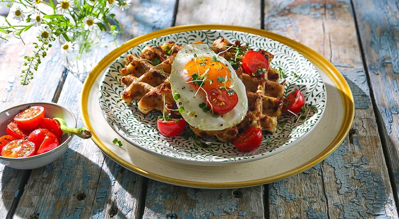 Dėkite į lėkštę po 2 vaflius, ant jų – po keptą kiaušinį ir pomidorų puseles. Pagardinkite pipirais, druska ir patiekite papuošę žalumynais.