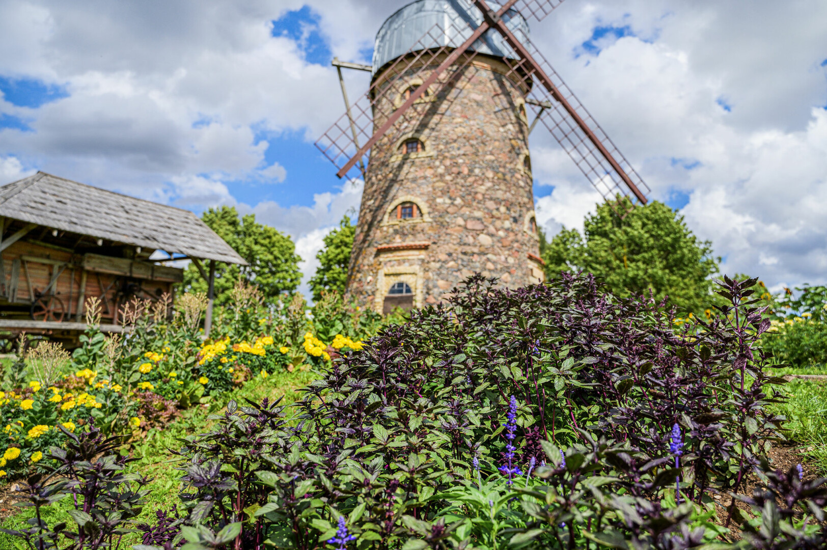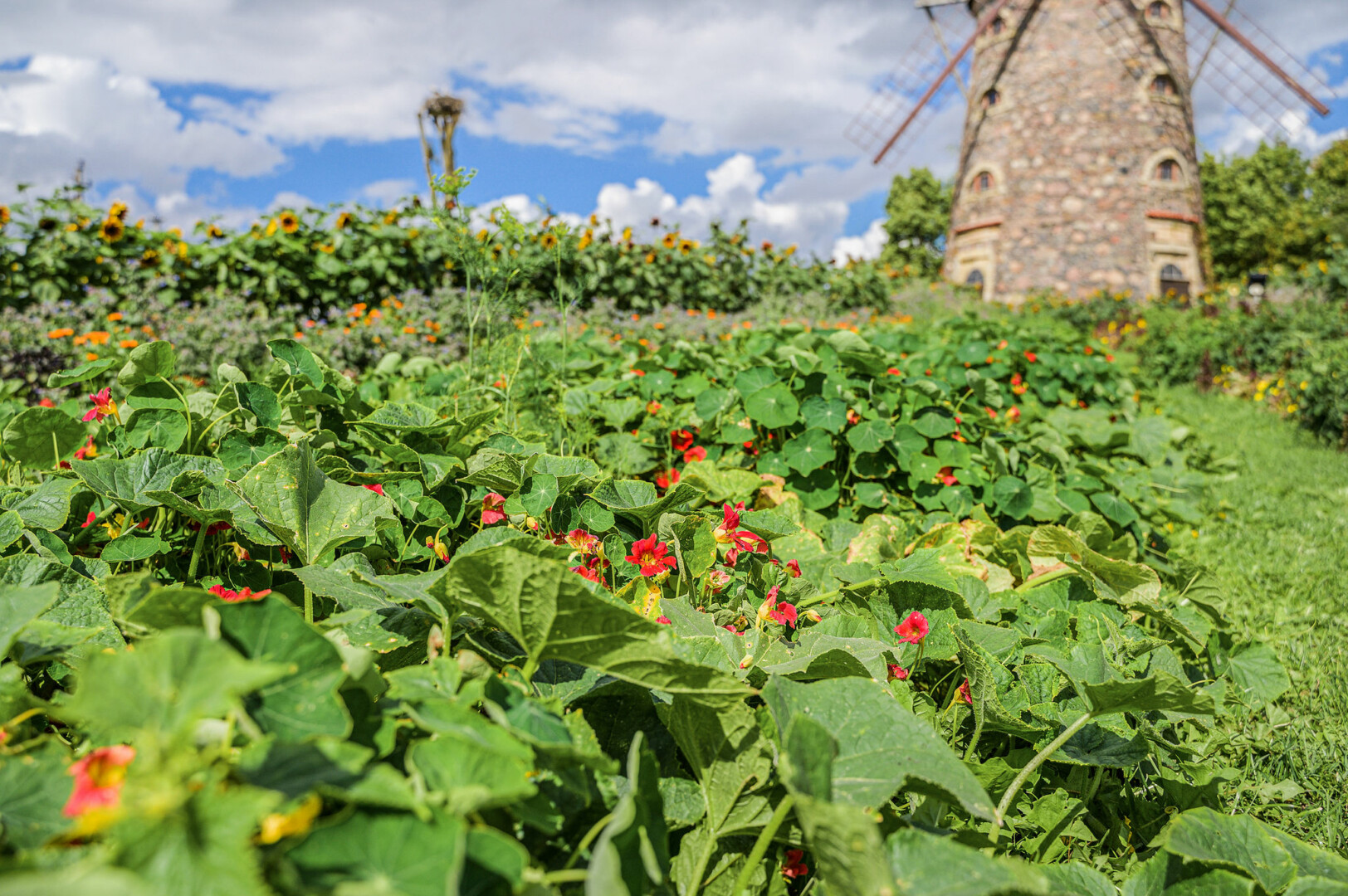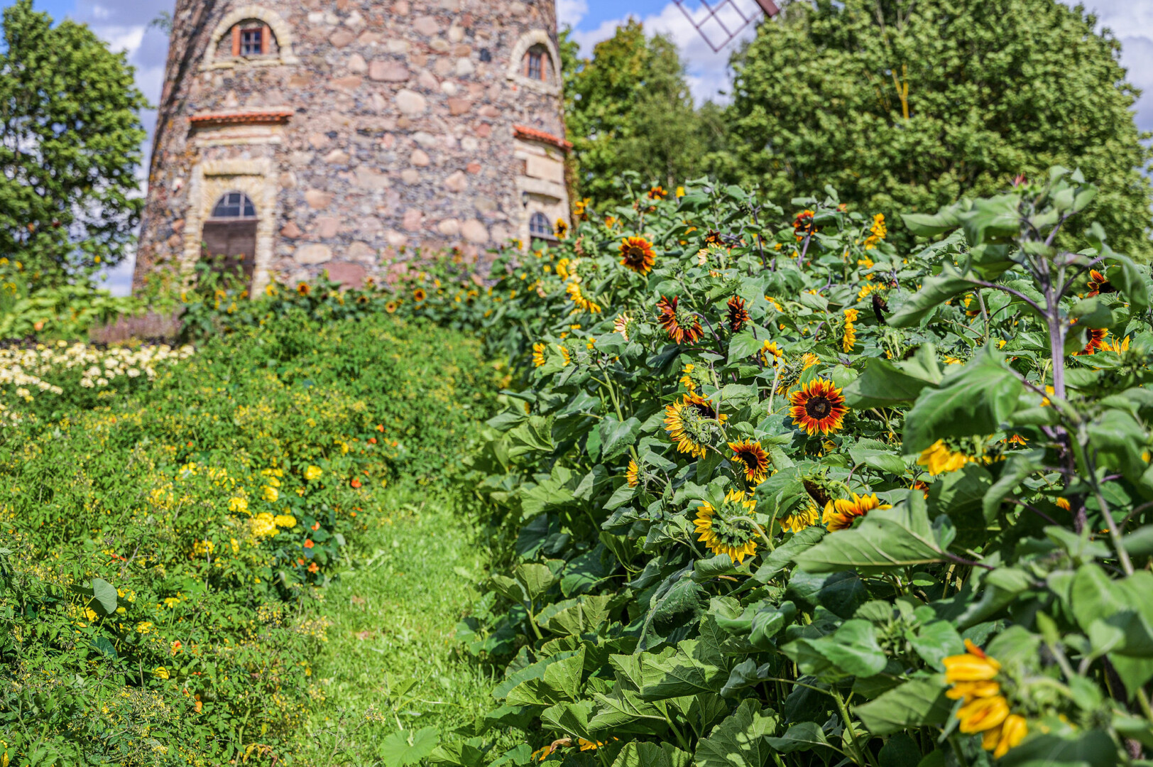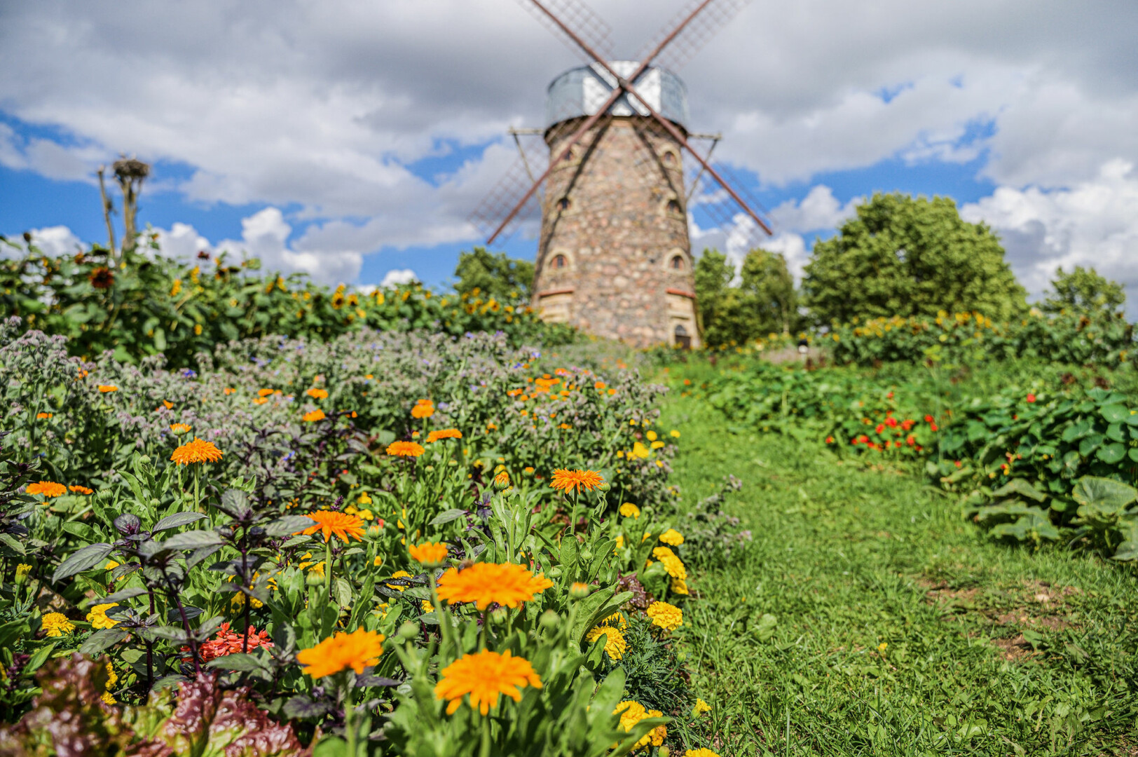 Nuo Pakruojo dvaro vėjo malūno tarsi saulės spinduliai nusidriekę gėlynai ne tik traukia akį savo išskirtine forma, žiedų grožiu, bet ir slepia netikėtą paslaptį. Akylesni pastebės, kad kiekvienas spindulys skirtingas, o tarp gėlių susodinta įvairių prieskoninių žolelių, lapinių bei kitų daržovių.