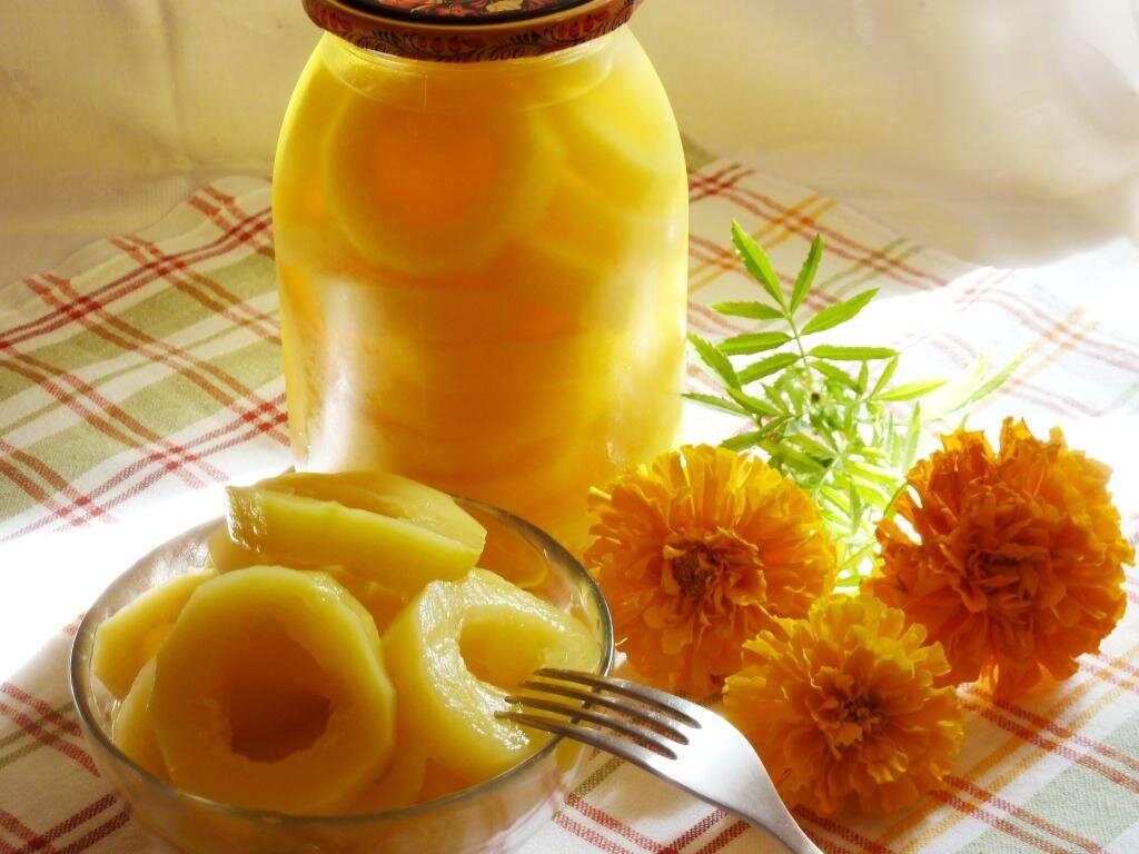 Reikės: 500 g jaunų cukinijų, 500 ml ananasų sulčių, 750 ml vandens, 3 šaukštų cukraus, 1 g citrinų rūgšties, vanilino.