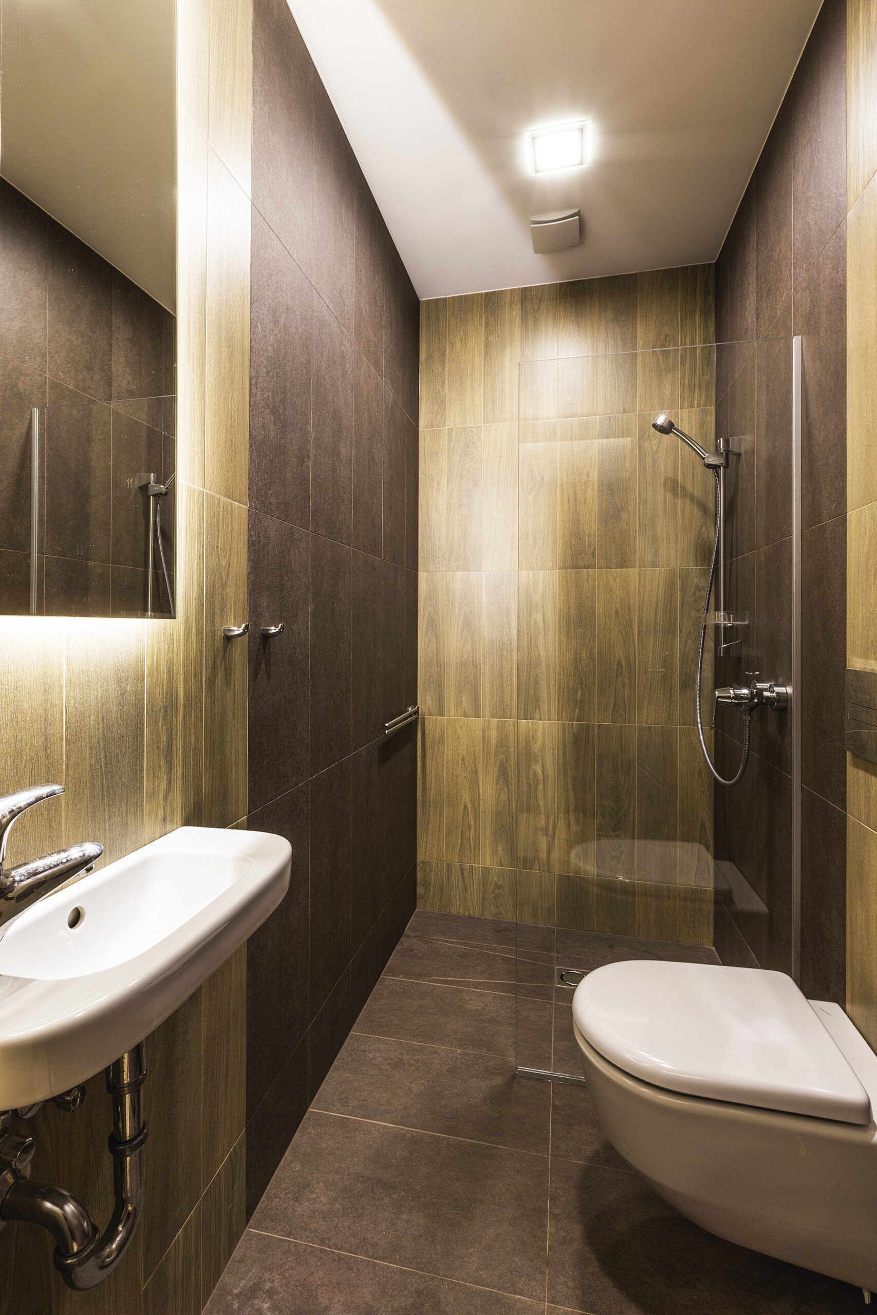 Nedidelį koridorių architektas dekoravo kontrasto principu. Kaip atsvara grubiam betonui ir atviroms durų ertmės plytoms įrengtos tvarkingos kabamosios lubos. Siaura lentynėlė – senų ąžuolinių durų fragmentas. Ant jos atsirado senovinis veidrodis vario spalva dažytais rėmais. Pilką sieną pagyvina šeimininko tapybos darbas, kaip pats sako, gimęs iš dažų likučių.