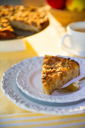 Labai šaltą margariną (sviestą) supjaustykite gabaliukais ir sudėkite į dubenį. Įberkite likusius ingredientus: miltus, rudąjį cukrų ir cinamoną. Trinkite šią masę tarp pirštų galiukų, kol susiformuos trupiniai (tai darykite keliais greitais judesiais, kad margarinas (sviestas) nespėtų sutižti, o trupiniai išeitų įvairaus dydžio). Jais pabarstykite pyrago viršų ir iškart pašaukite į orkaitę. Kepkite apie 60 minučių arba tol, kol pyragas pagels, o trupiniai viršuje karamelizuosis.