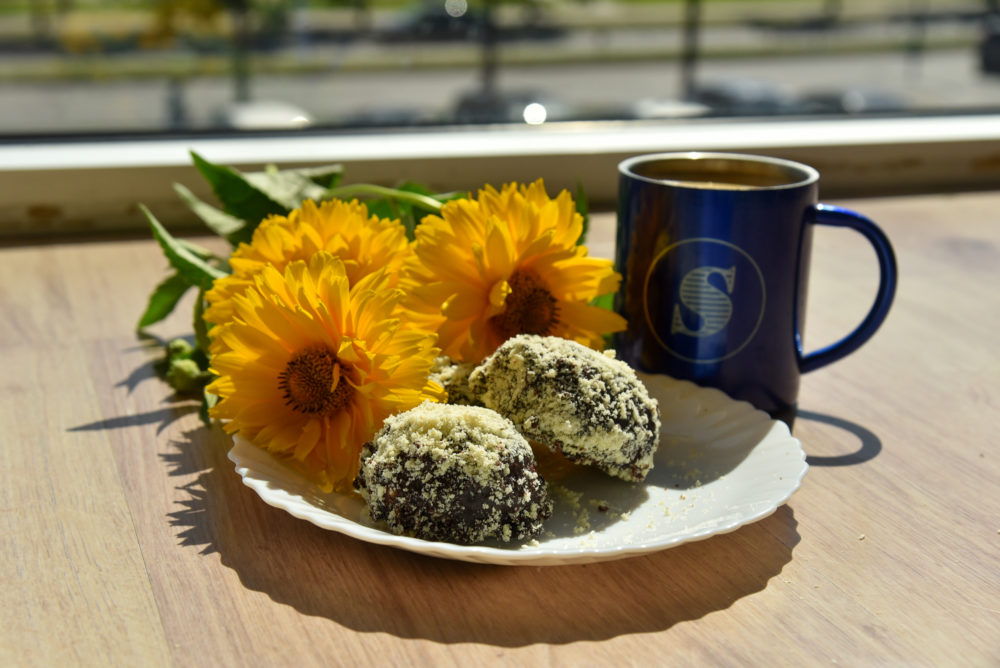 Ir galiausiai po vieną rutuliuką aptepame glaistu, apibarstome vaflių pabarstukais. Tai darome labai greitai ir kruopščiai, nes glaistas labai greitai stingsta.