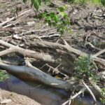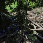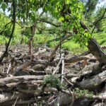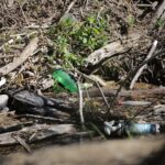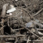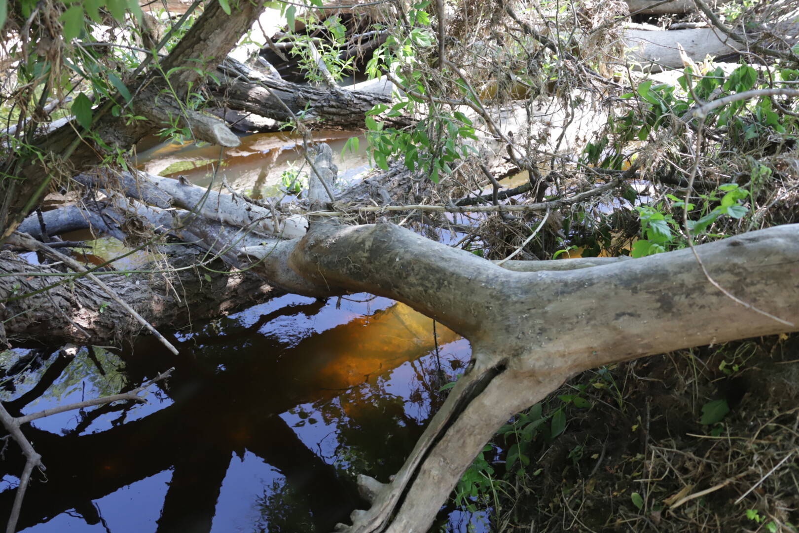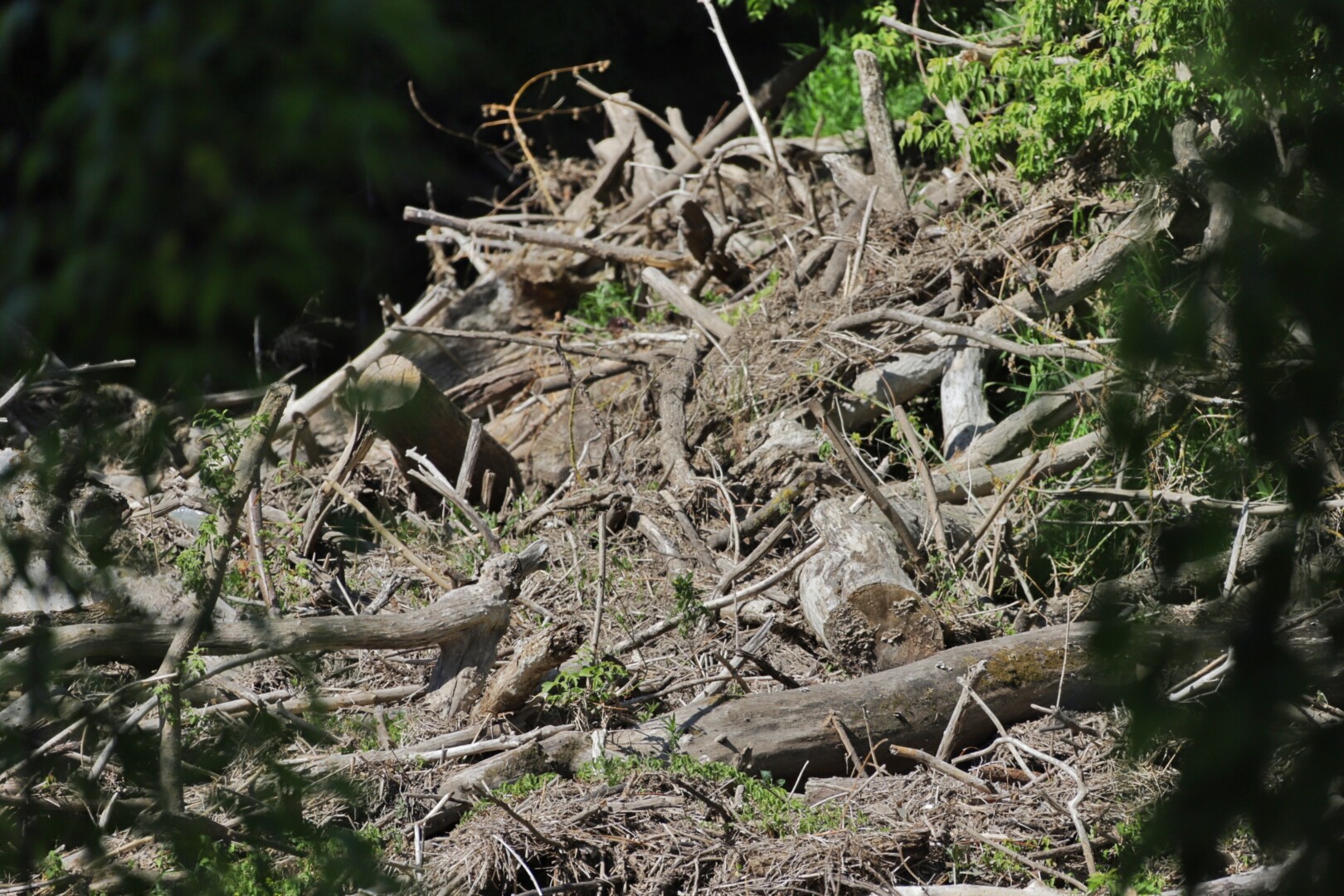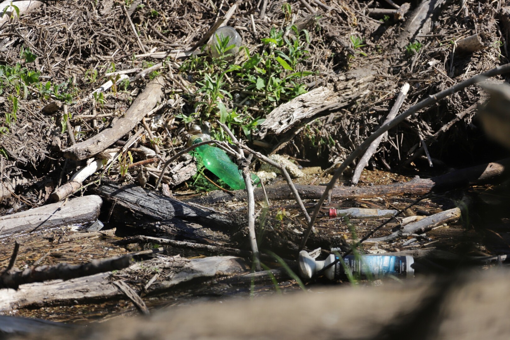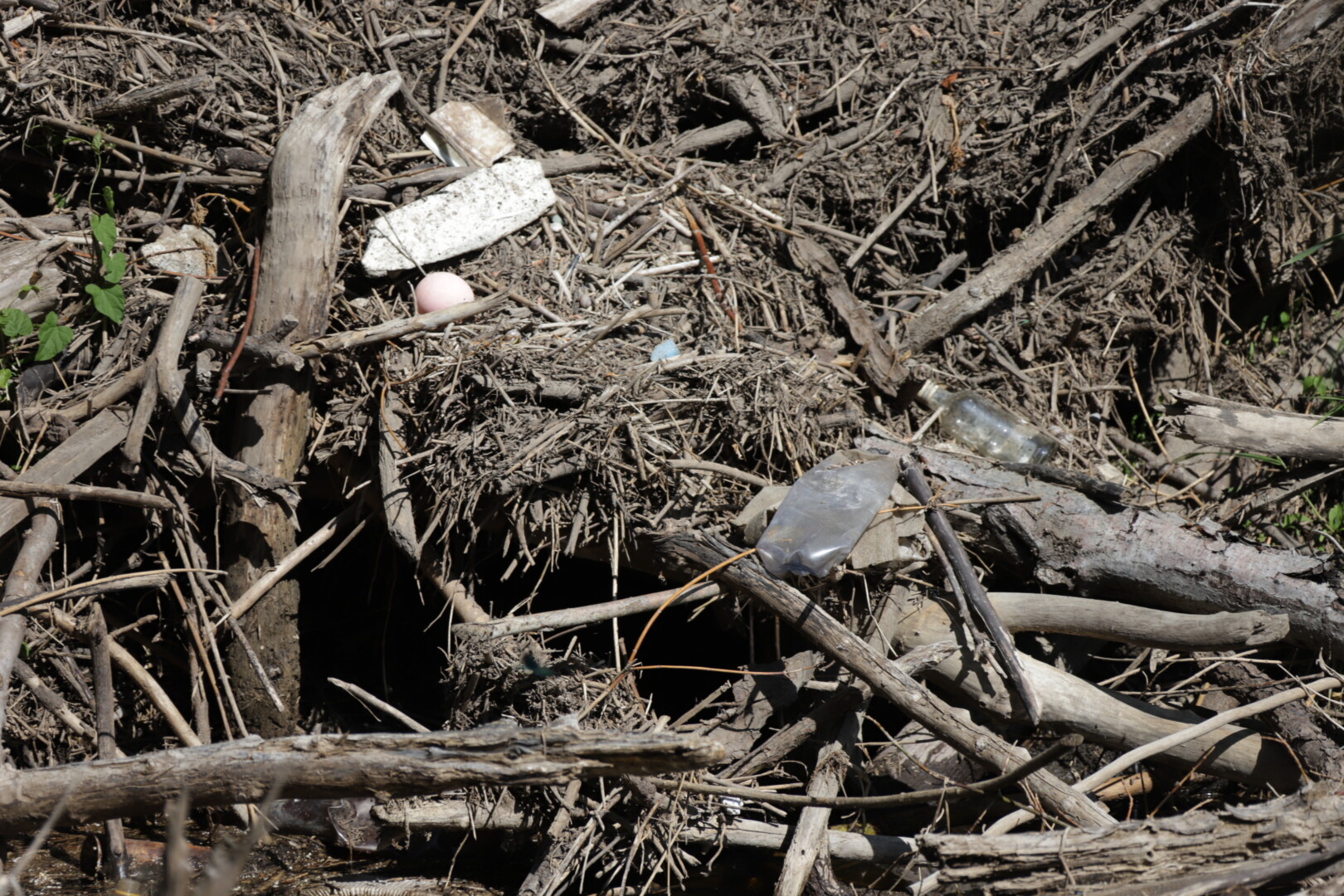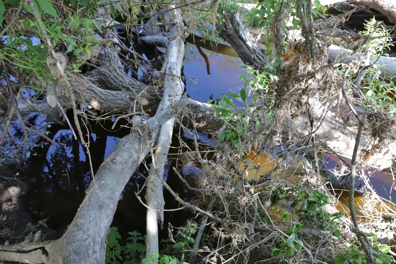 Tarp kone trimis aukštais suvirtusių medžių plūduriuoja galybė šiukšlių, matyti ir nugaišęs sunkiai atpažįstamas gyvis, greičiausiai žiurkė.