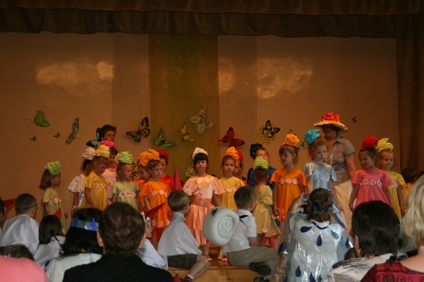 Mažosios bitutės, gėlytės, boružėlės, paukšteliai, saulytė ir lietutis sugužėjo ant scenos, kad pradžiugintų visus susirinkusiuosius savita programa, spalvingais apdarais, kūrybiškumu.